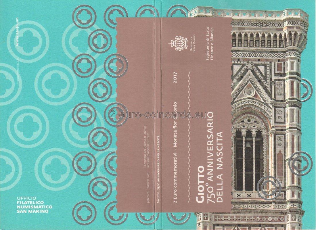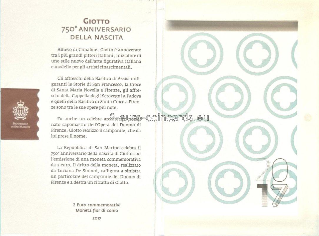 Na ľavej strane mince sa nachádza detail veže s hodinami z jedného z Giottovych architektonických diel, dómu Santa Maria del Fiore vo Florencii, a vertikálne umiestnené slová SAN MARINO, GIOTTO a roky 1267-2017. Na pravej strane je detail portrétu Giotta a iniciály autora mince Luciany de Simoni (LDS). V dolnej časti je písmeno "R", značka mincovne v Ríme.