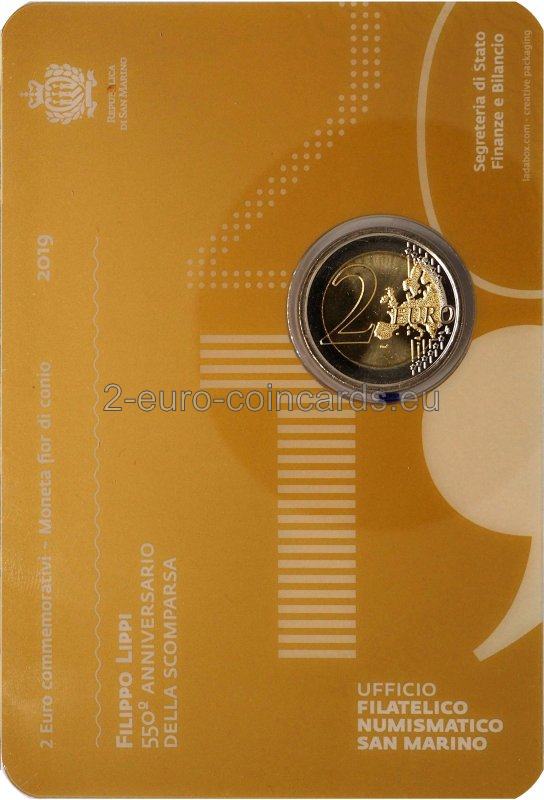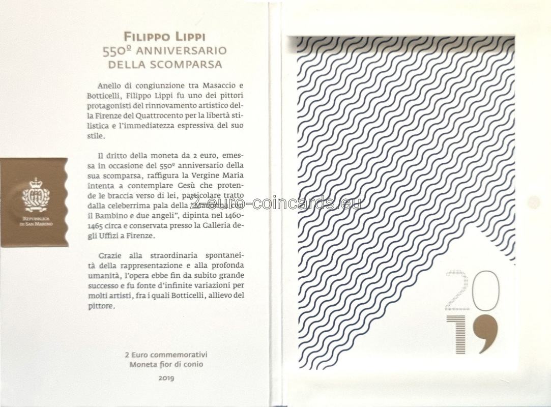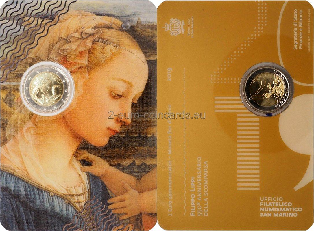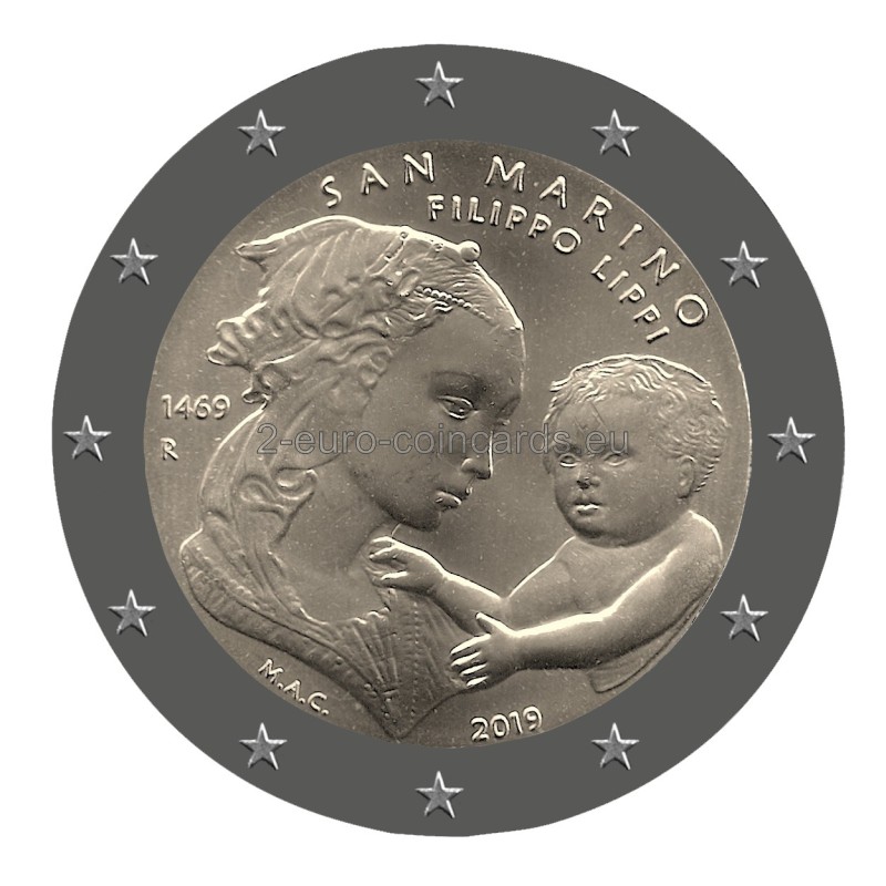 Na minci je v strede vyobrazená Madona s dieťaťom, detail maľby Filippa Lippiho „Madona s dieťaťom a dvaja anjeli“, v hornej časti je nápis „SAN MARINO“ a „FILIPPO LIPPI“ a vľavo rok „1469“ a písmeno R označujúce mincovňu v Ríme. V dolnej časti sa nachádzajú iniciály autorky Marie Angely Cassinolovej „M.A.C.“ a v strede rok „2019“.