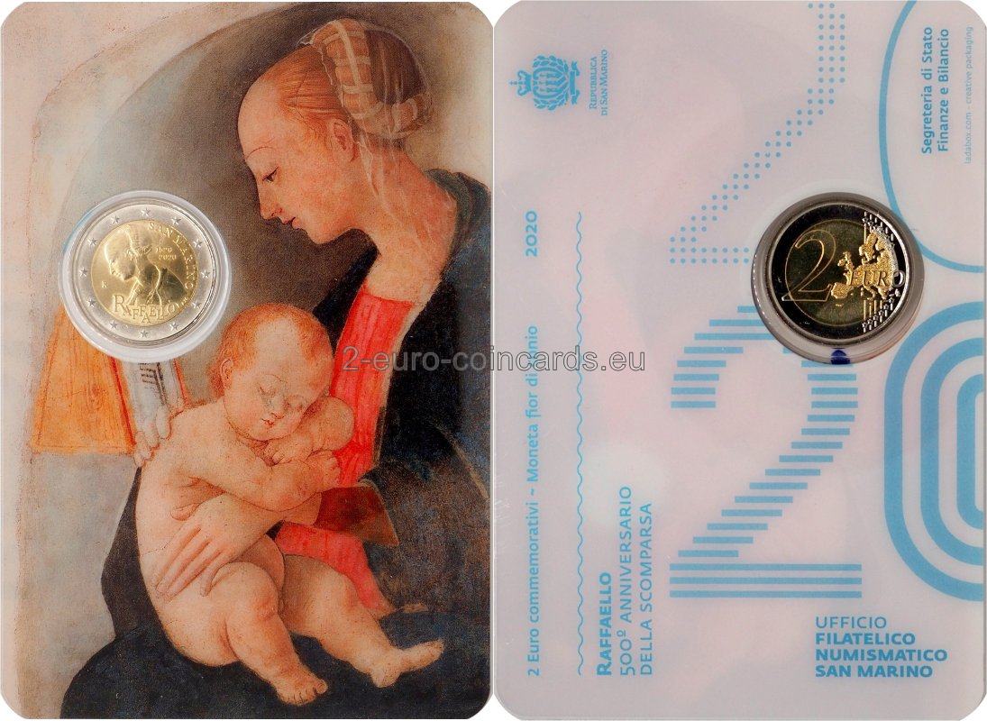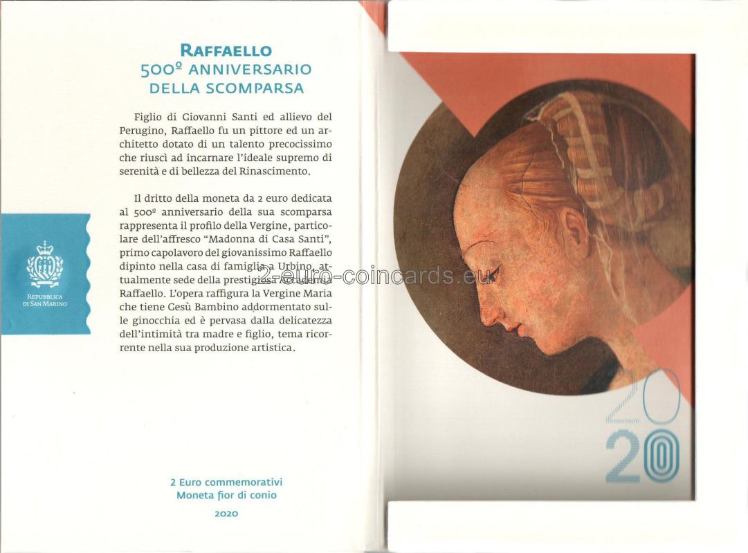 Na vzore je vyobrazený profil Panny Márie, detail fresky „Madonna di Casa Santi“. V pravej hornej časti mince sa nachádza názov vydávajúcej krajiny „SAN MARINO“ a roky „1520“ a „2020“. V dolnej časti mince je nápis „RAFFAELLO“, vpravo od neho iniciály autorky Annalisy Masiniovej „A.M.“ a vľavo písmeno „R“, značka rímskej mincovne.