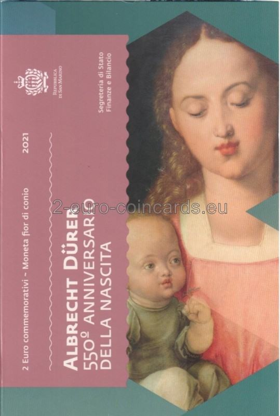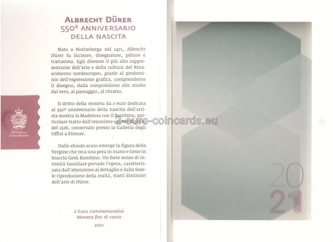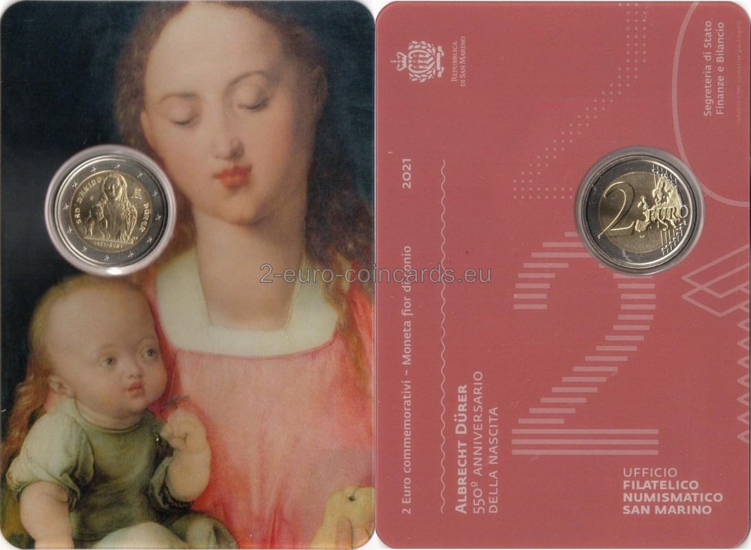 Na vzore je vyobrazená Panna Mária s Ježiškom, časť obrazu Albrechta Dürera Madona s dieťaťom, ktorý sa nachádza v galérii Uffizi vo Florencii. Vľavo je nápis „SAN MARINO“ a znak mincovne „R“. Vpravo hore sa nachádza monogram Albrechta Dürera „AD“ a na pravej strane nápis „DÜRER“. V dolnej časti mince sú iniciály autora vzoru Valeria De Seta „VdS“ a roky „1471 – 2021“.