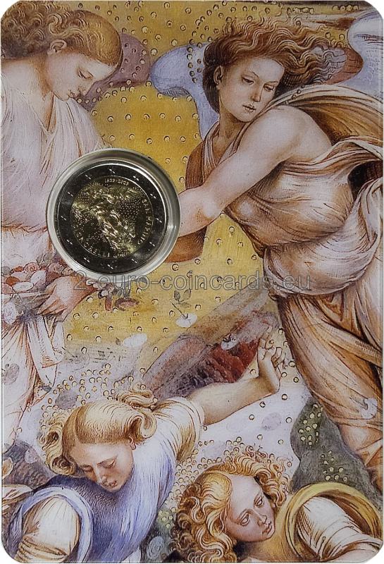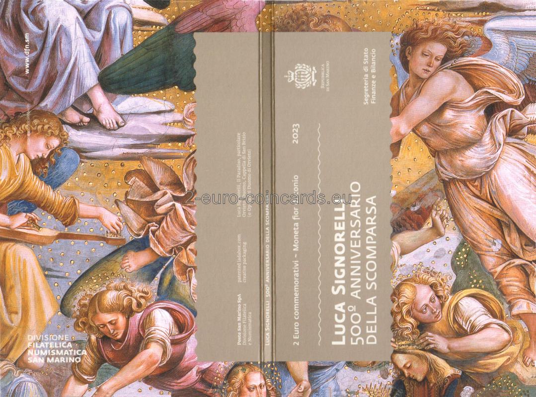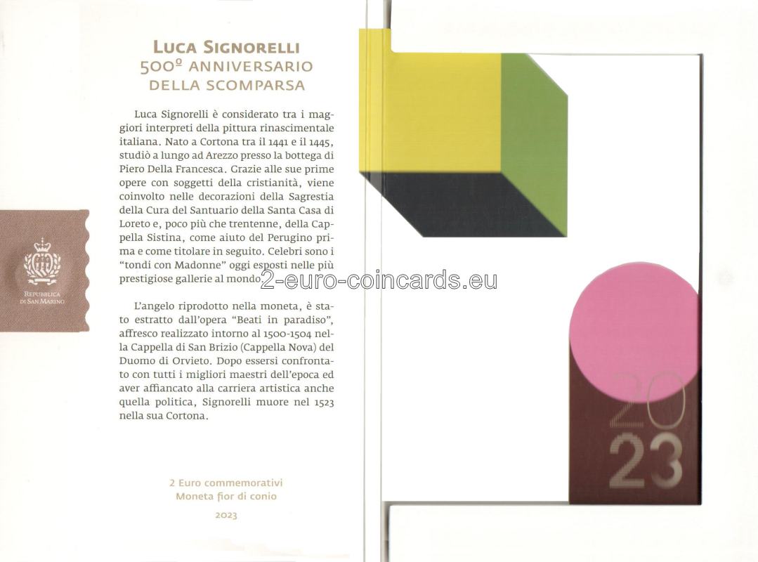 V strede mince je vyobrazený anjel, detail z obrazu „Il Paradiso“, ktorý namaľoval Luca Signorelli, zachovaného v kaplnke San Brizio v katedrále v Orviete. Na ľavej strane sa nachádza písmeno „R“ označujúce rímsku mincovňu. Vľavo dole je do polkruhu uvedené slovo „SIGNORELLI“. Na pravej strane sa nachádza názov vydávajúcej krajiny „SAN MARINO“ a hore sú uvedené roky „1523 2023“. V spodnej časti mince v strede sa nachádzajú iniciály autorky Marty Bonifaciovej „MB“.