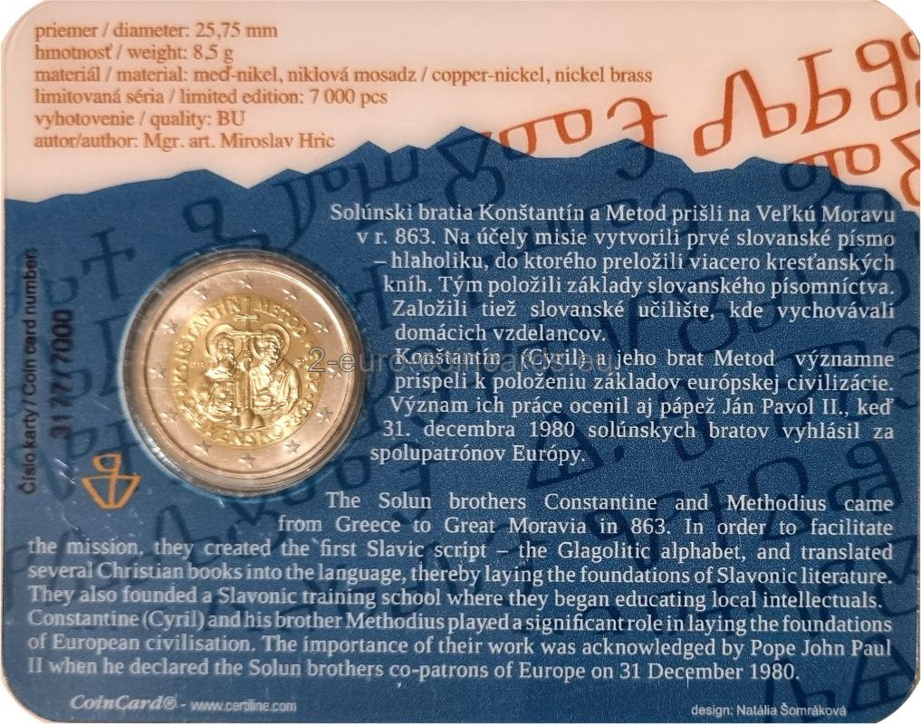 Do tradičnej súťaže o návrh mince sa prihlásilo 22 prác od 13 autorov. Z nich osobitná komisia Národnej banky Slovenska vybrala v júni 2012 najlepší návrh. Počas konzultačného konania však Európska komisia pôvodný návrh mince zamietla. Národná banka Slovenska musela z mince odstrániť náboženské symboly - svätožiare a kríže na páliu Metoda. Toto rozhodnutie Európskej komisie vyvolalo na Slovensku pobúrenie. Miestni katolícki biskupi uviedli, že vyjadruje neúctu ku kresťanským tradíciám v Európe. Po rokovaniach v decembri 2012 medzi slovenským ministrom financií Petrom Kažimírom a ministrami financií ostatných krajín eurozóny Rada Európskej únie pôvodný návrh mince predsa len schválila.