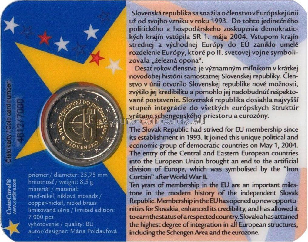 V strede národnej strany mince sú štylizované písmená „EÚ“ ako skratka výrazu Európska únia so štátnym znakom Slovenskej republiky, ktorý je začlenený do popredia. Na pravej strane vnútornej časti mince je v dvoch riadkoch vyobrazený dátum pristúpenia Slovenskej republiky k Európskej únii „1.5.2004“ a bezprostredne pod ním rok „2014“. Na dolnom okraji vnútornej časti mince sa nachádza vpísaný názov vydávajúcej krajiny „SLOVENSKO“, pričom na hornom okraji sú v polkruhu uvedené slová „10. VÝROČIE VSTUPU DO EURÓPSKEJ ÚNIE“. Vľavo dole je značka mincovne Kremnica (pozostávajúca z písmen „MK“ medzi dvoma razidlami) a vpravo dole sa nachádzajú štylizované písmená „MP“, ktoré sú iniciálkami autorky motívu Márie Poldaufovej.