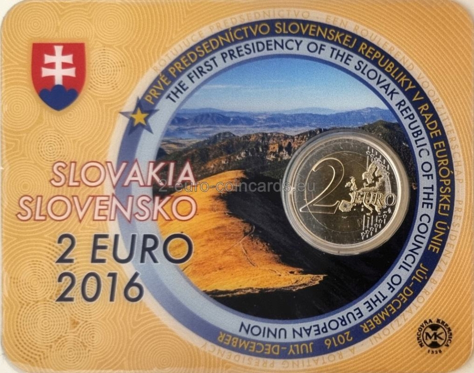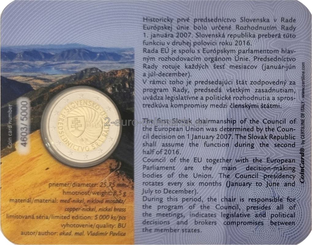 Dominantou vzoru je štátny znak Slovenskej republiky v strede na pozadí dynamických zbiehajúcich sa čiar predstavujúcich postavenie a význam Slovenskej republiky počas jej predsedníctva v Rade Európskej únie. Vpravo od štátneho znaku Slovenskej republiky je uvedený rok „2016“. Okolo okraja vnútorného kruhu je názov krajiny „SLOVENSKO“ a nápis „PREDSEDNÍCTVO SR V RADE EÚ“. Tieto dva nápisy sú od seba oddelené grafickými symbolmi. Značka mincovne v Kremnici, pozostávajúca z písmen „MK“ umiestnenými medzi dvoma razidlami, a štylizované písmená „VP“, iniciály autora mince, Vladimíra Pavlicu, sú umiestnené v dolnej časti.
