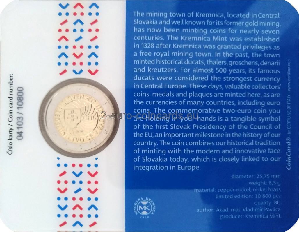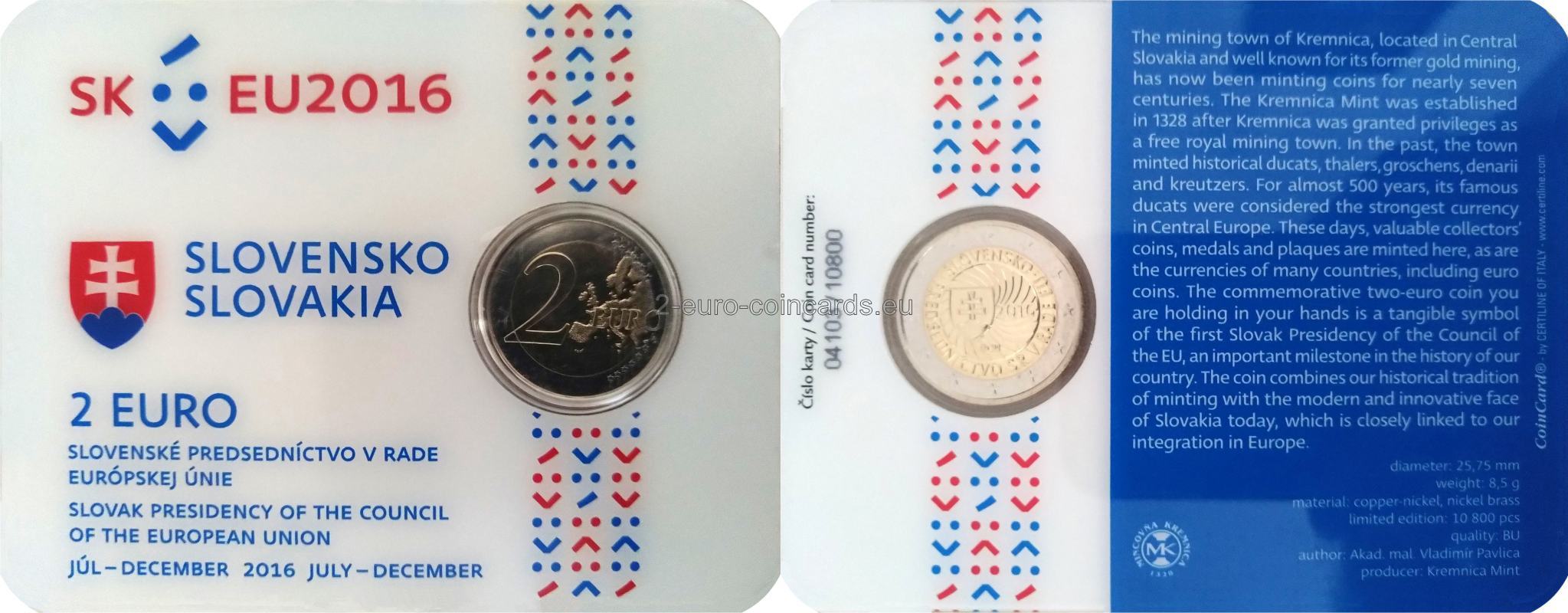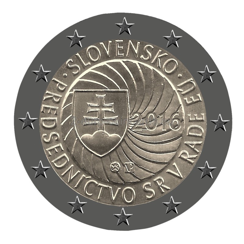 Dominantou vzoru je štátny znak Slovenskej republiky v strede na pozadí dynamických zbiehajúcich sa čiar predstavujúcich postavenie a význam Slovenskej republiky počas jej predsedníctva v Rade Európskej únie. Vpravo od štátneho znaku Slovenskej republiky je uvedený rok „2016“. Okolo okraja vnútorného kruhu je názov krajiny „SLOVENSKO“ a nápis „PREDSEDNÍCTVO SR V RADE EÚ“. Tieto dva nápisy sú od seba oddelené grafickými symbolmi. Značka mincovne v Kremnici, pozostávajúca z písmen „MK“ umiestnenými medzi dvoma razidlami, a štylizované písmená „VP“, iniciály autora mince, Vladimíra Pavlicu, sú umiestnené v dolnej časti.