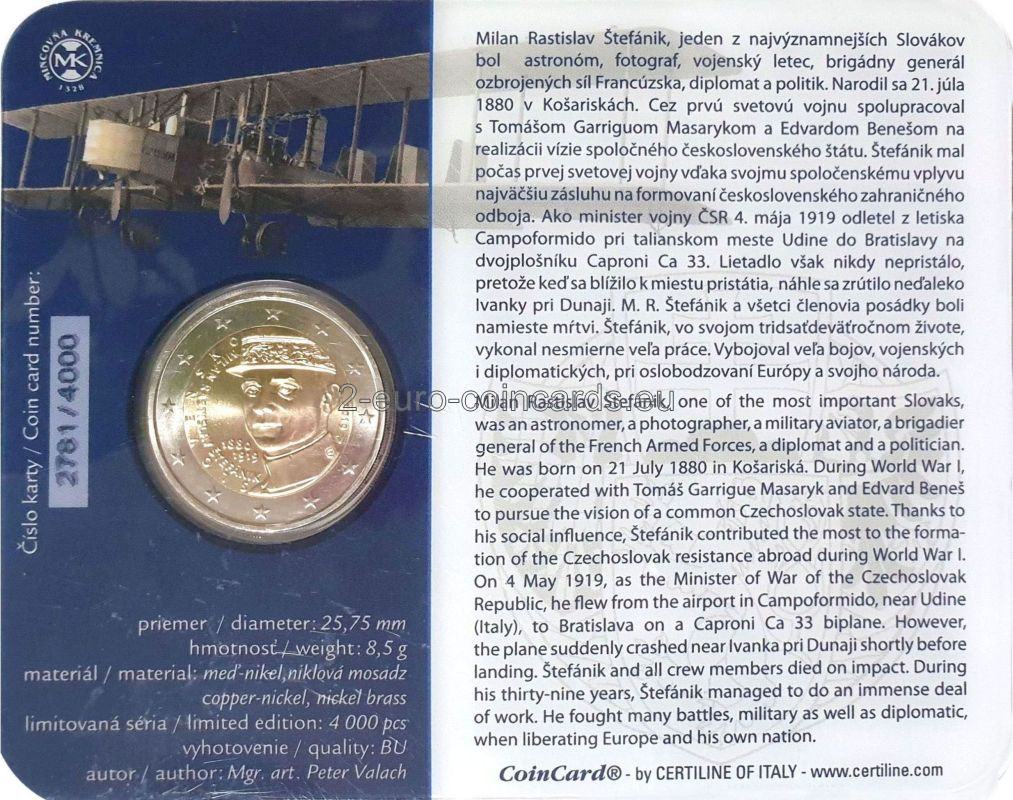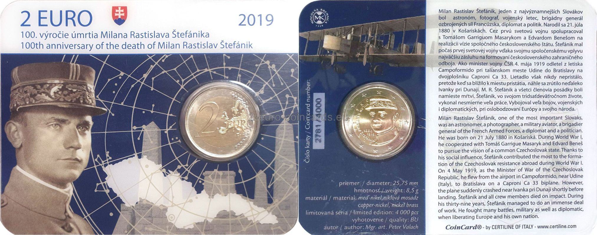 Na vyobrazení sa nachádza portrét Milana Rastislava Štefánika. Na ľavej strane portrétu sa nachádzajú dátumy narodenia a úmrtia Štefánika „1880“ a „1919“, jeden nad druhým. Na ľavej strane vnútornej časti mince je v polkruhu uvedené meno „MILAN RASTISLAV ŠTEFÁNIK“ a meno vydávajúcej krajiny „SLOVENSKO“. Rok vydania „2019“ sa nachádza medzi portrétom a pravou stranou. Pod rokom sú štylizované písmená „PV“, iniciály autora návrhu Petra Valacha, a pod nimi je značka Mincovne Kremnica, ktorá pozostáva z písmen „MK“ umiestnených medzi dvoma razidlami.