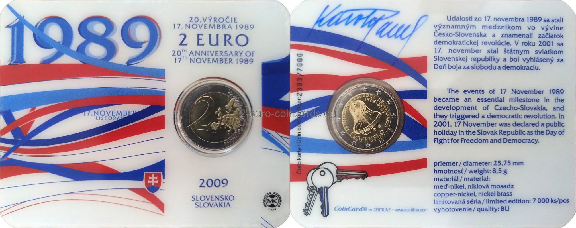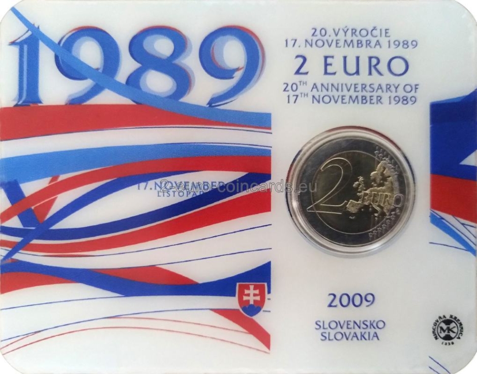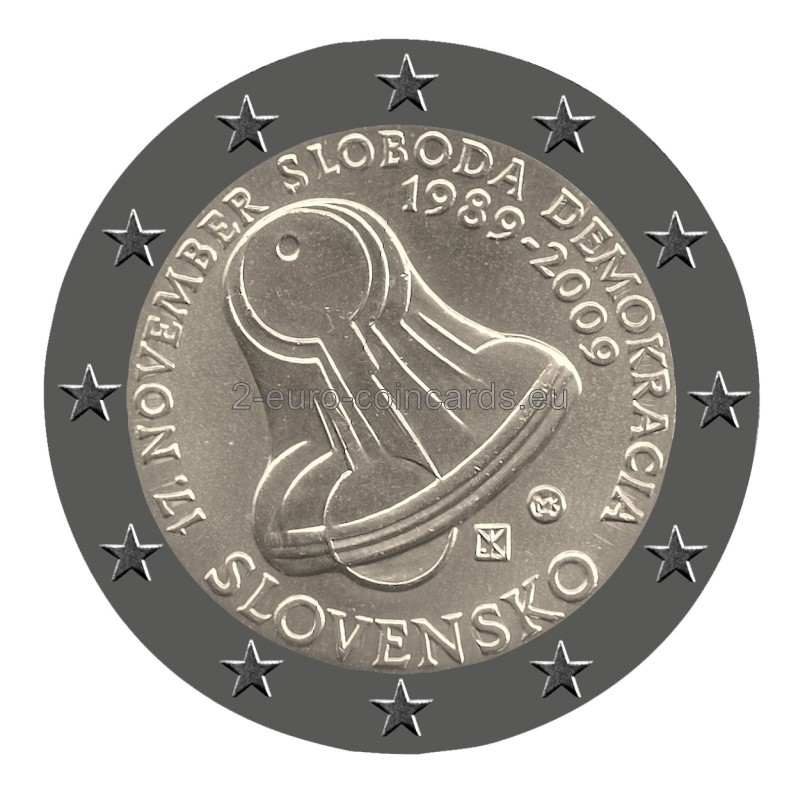 Vo vnútornej časti mince je vyobrazený štylizovaný zvon tvorený niekoľkými kľúčmi, ktorý pripomína demonštráciu zo 17. novembra 1989, počas ktorej občania kráčali a mávali kľúčmi na znak toho, že „odzvonilo“, čo bolo začiatkom „zamatovej revolúcie“. Vpravo pod týmto motívom je umiestnená značka umelca Pavel Károly (štylizované písmená "PK") a značka Mincovne Kremnica (skratka "MK" v kruhu). Motív je zhora obklopený nápisom „17. NOVEMBER SLOBODA – DEMOKRACIA“ a rokmi „1989 – 2009“ a v dolnej časti údajom o vydávajúcej krajine „SLOVENSKO“.