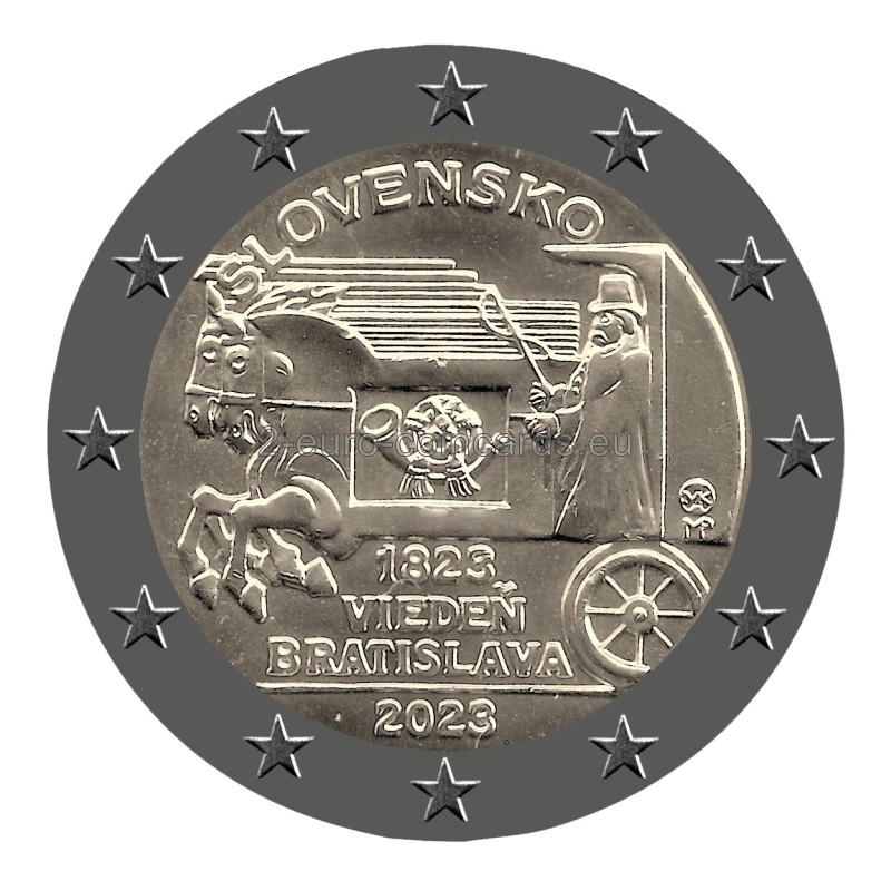 Na minci je symbolické vyobrazenie expresnej pošty ťahanej koňmi na trase Viedeň – Bratislava s motívom koňa ťahajúceho vozeň v rýchlom pohybe a obdĺžnikovým útvarom umiestneným v strede, v ktorom sa nachádza lesný roh. Pod obrázkom je uvedený rok „1823“, kedy začala prevádzka expresnej pošty ťahanej koňmi, a pod ním sa uvádzajú názvy miest v slovenskom jazyku „VIEDEŇ“ a „BRATISLAVA“, taktiež usporiadané pod sebou. V spodnej časti vnútorného kruhu mince je rok vydania „2023“, ktorý je od textu oddelený vodorovnou čiarou. Pozdĺž horného okraja motívu je umiestnený názov vydávajúcej krajiny „SLOVENSKO“. Na pravej strane motívu sa nachádza značka Mincovne Kremnica pozostávajúca z písmen „MK“ medzi dvoma razidlami. Tesne pod značkou sa nachádzajú štylizované iniciály autorky návrhu národnej strany mince Márie Poldaufovej „MP“.