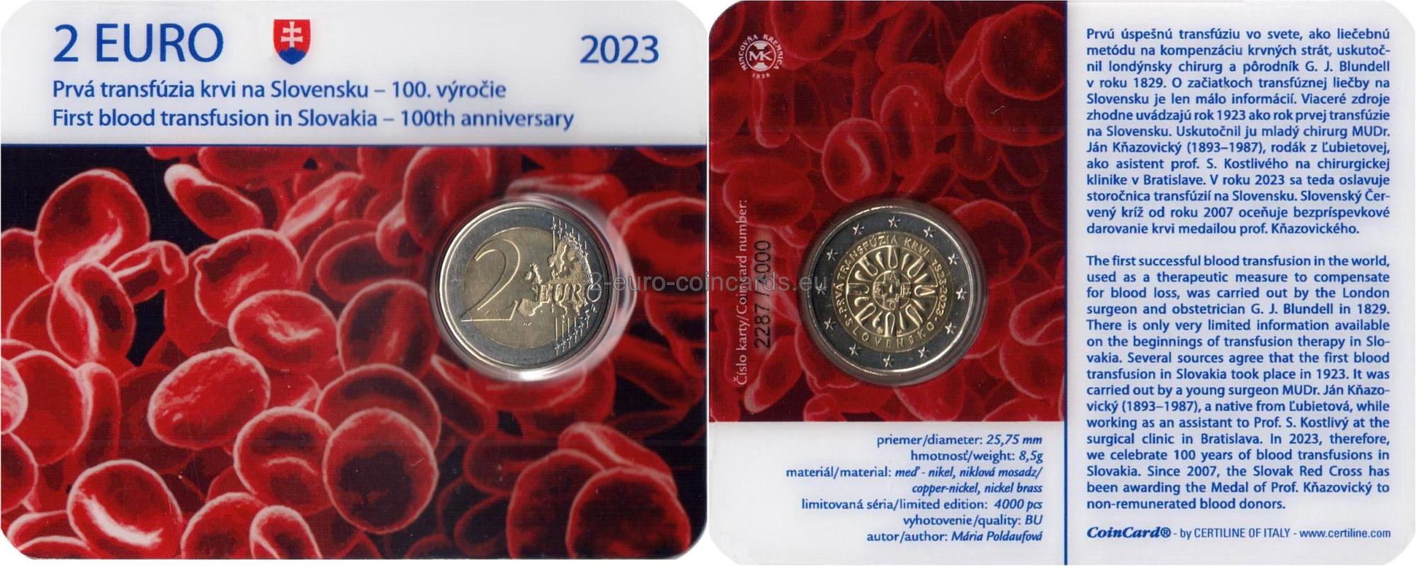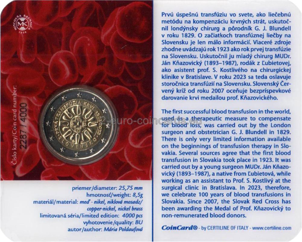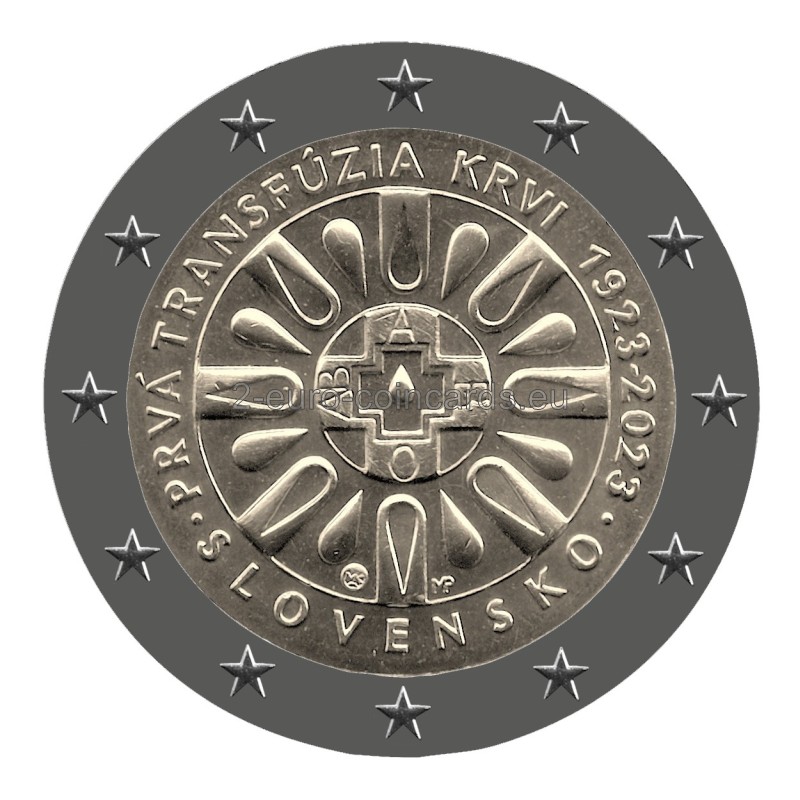Motív mince zobrazuje niekoľko rôznych prvkov na tému transfúzie krvi. Ústredným prvkom je kvapka krvi v červenom kríži obklopená informáciami o rôznych krvných skupinách. Okolo kríža sú do kruhu usporiadané kvapky krvi. Nad motívom sa nachádza text "PRVA TRANSFÚZIA KRVI" s dátumami 1923 - 2023 a krajinou vydania "Slovensko". V dolnej časti je vľavo značka Mincovne Kremnica, ktorá pozostáva z písmen „MK“ umiestnených medzi dvoma razidlami a vpravo štylizované písmená „MP“, iniciály autora návrhu (Mária Poldaufová).
