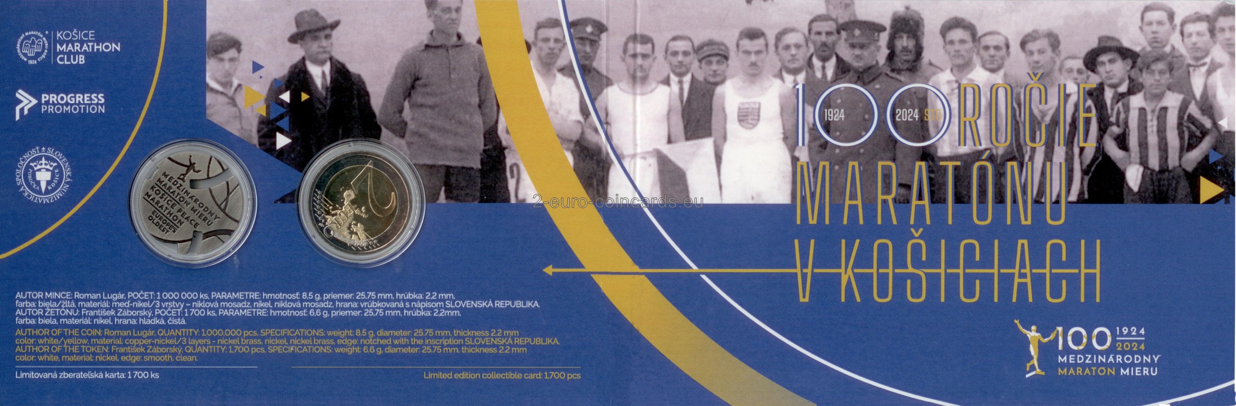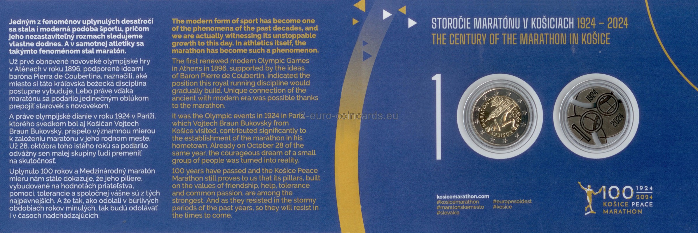 Na minci je zobrazený maratónsky bežec v akcii, ktorý symbolizuje športového ducha a tradíciu košického maratónu. V pozadí je vidieť Dóm svätej Alžbety v Košiciach. Táto ikonická pamiatka mesta dodáva dizajnu historický a kultúrny rozmer. V hornej časti mince je v oblúku nápis „KOŠICKÝ MARATÓN“. V spodnej časti, tiež v oblúku, je nápis „SLOVENSKO“, za ktorým nasledujú letopočty „1924-2024“ označujúce sté výročie podujatia.