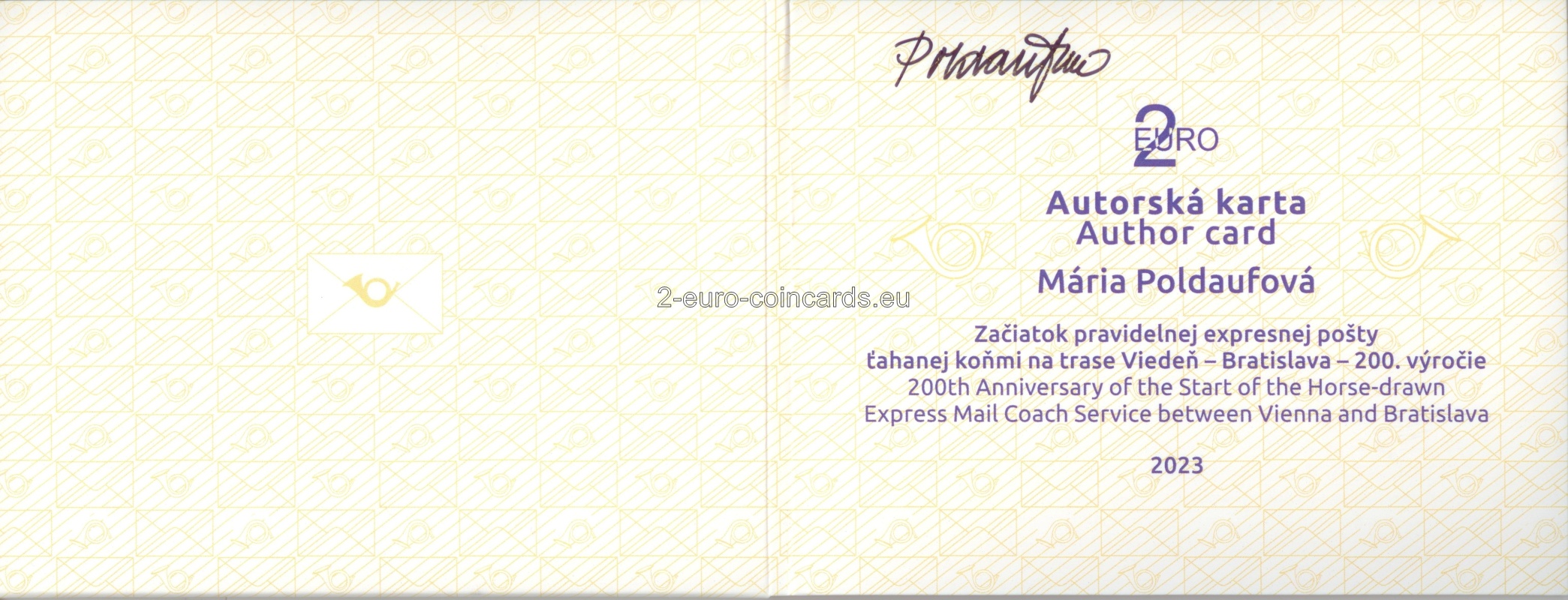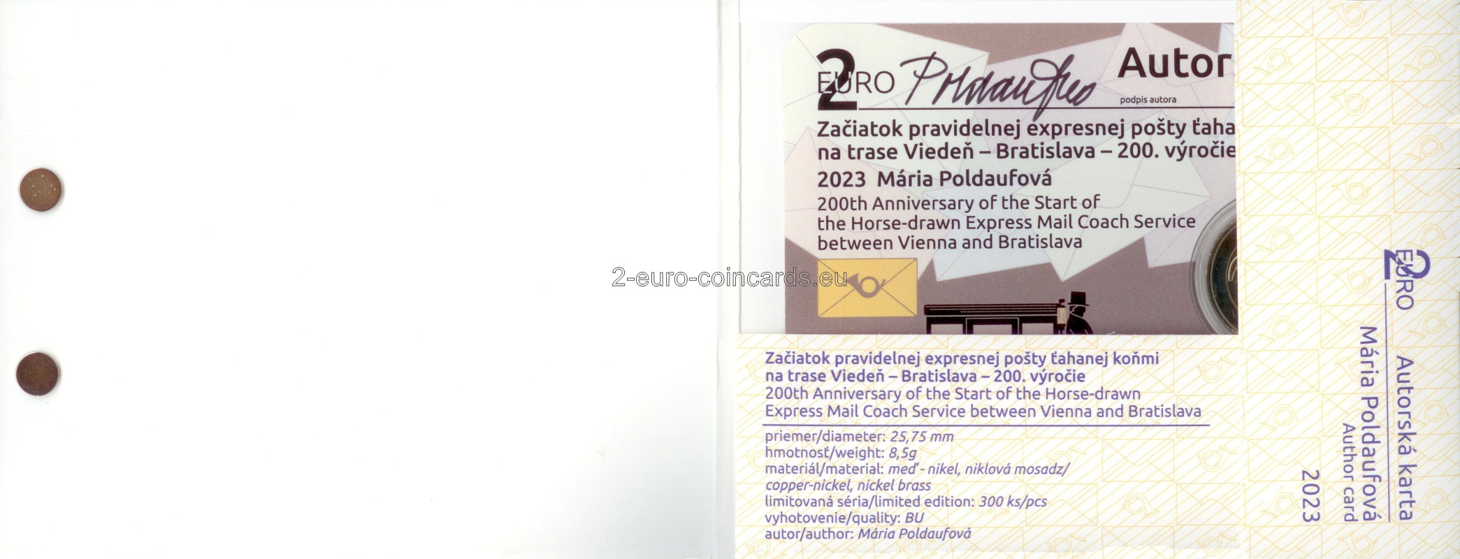 Na minci je symbolické vyobrazenie expresnej pošty ťahanej koňmi na trase Viedeň – Bratislava s motívom koňa ťahajúceho vozeň v rýchlom pohybe a obdĺžnikovým útvarom umiestneným v strede, v ktorom sa nachádza lesný roh. Pod obrázkom je uvedený rok „1823“, kedy začala prevádzka expresnej pošty ťahanej koňmi, a pod ním sa uvádzajú názvy miest v slovenskom jazyku „VIEDEŇ“ a „BRATISLAVA“, taktiež usporiadané pod sebou. V spodnej časti vnútorného kruhu mince je rok vydania „2023“, ktorý je od textu oddelený vodorovnou čiarou. Pozdĺž horného okraja motívu je umiestnený názov vydávajúcej krajiny „SLOVENSKO“. Na pravej strane motívu sa nachádza značka Mincovne Kremnica pozostávajúca z písmen „MK“ medzi dvoma razidlami. Tesne pod značkou sa nachádzajú štylizované iniciály autorky návrhu národnej strany mince Márie Poldaufovej „MP“.