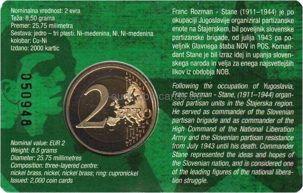Na vnútornom disku je štylizovaný portrét Franza Rozmana. Na jeho hrudi je päťcípa hviezda. Vpravo je vyrytý názov vydávajúceho štátu "SLOVENIJA" a nad ním zvislý nápis v troch riadkoch: "FRANC ROZMAN STANE" a vodorovne v 2 riadkoch sú uvedené roky hrdinovho života: "1911 1944". Pod názvom štátu je vertikálne uvedený aj rok vydania mince: "2011".