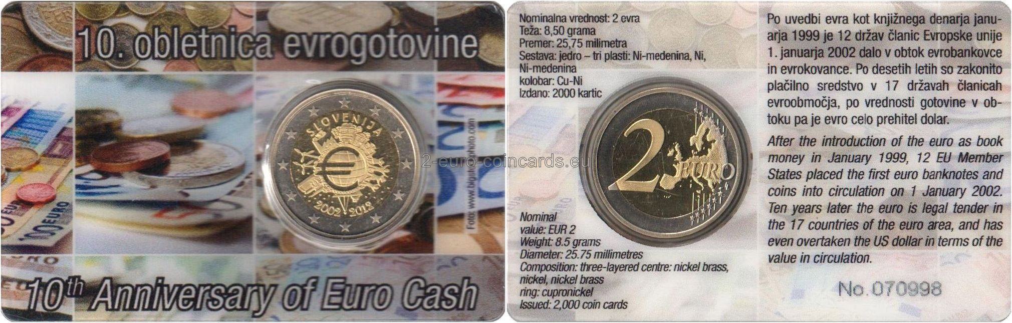 Znak eura v strede mince znamená, že euro sa stalo mimoriadne dôležitou súčasťou Európy, ale aj sveta, pretože sa v priebehu posledných 10 rokov stalo globálnym hráčom v rámci medzinárodného menového systému. Jednotlivé prvky motívu okolo symbolu eura na minci vyjadrujú význam eura pre ľudí, pre finančný svet (veža ECB), pre obchod (lode), priemysel (továrne), pre odvetvie energetiky, výskumu a vývoja (veterné elektrárne). Iniciály autora návrhu „A.H.“ sa dajú objaviť (ak sa pozriete veľmi pozorne) medzi loďou a budovou Eurotower. Pozdĺž horného okraja vnútornej časti mince je uvedená krajina vydania (SLOVENIJA), zatiaľ čo označenie 2002 – 2012 je umiestnené v dolnej časti.