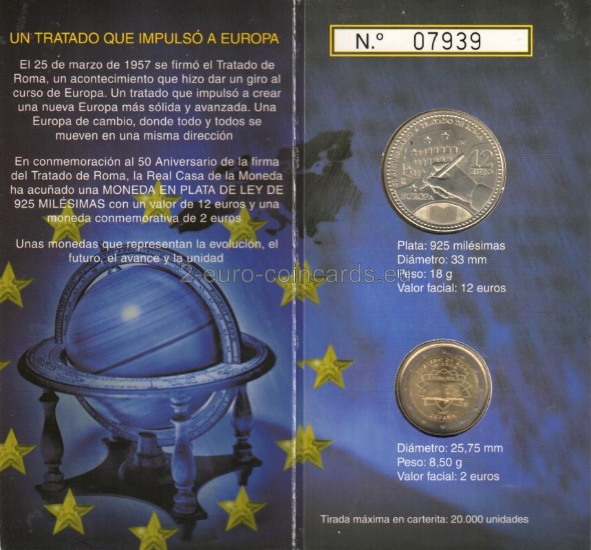 Dňa 25. marca 1957 bola podpísaná Rímska zmluva, udalosť, ktorá zmenila smerovanie Európy. Zmluva, ktorá dala podnet na vytvorenie novej, silnejšej a vyspelejšej Európy. Európu plnú zmien, v ktorej sa všetko a všetci uberajú rovnakým smerom. Pri príležitosti 50. výročia podpísania Rímskej zmluvy vyrazila španielska kráľovská mincovňa striebornú mincu s rýdzosťou 925 v hodnote 12 eur a pamätnú mincu v hodnote 2 eur. Mince predstavujú vývoj, budúcnosť, pokrok a jednotu.