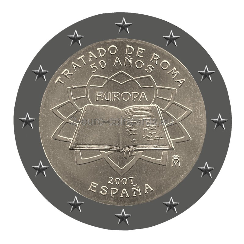 Stred mince zobrazuje Zmluvu podpísanú šiestimi zakladajúcimi členskými štátmi na pozadí evokujúcom dlažbu námestia Piazza del Campidoglio v Ríme, navrhnutú Michelangelom, kde bola 25. marca 1957 Zmluva podpísaná. Nad knihou sa je uvedený preklad slov „Treaty of Rome 50 years“ TRATADO DE ROMA/50 AÑOS/EUROPA. Pod knihou je vpísaný rok 2007 a národná podoba názvu vydávajúcej krajiny "ESPAÑA".
