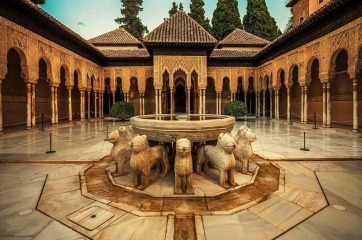 Alhambra a El Albaicín, ktoré sa týčia nad moderným dolným mestom a nachádzajú sa na dvoch priľahlých kopcoch, tvoria stredovekú časť Granady. Na východ od Alhambry sa nachádza bývalé vidiecke sídlo sultánov, Generalife, postavené v roku 1250. Palác je obklopený zelenými, chladnými záhradami a má množstvo bazénov a fontán. Obytná štvrť Albaycin je bohatou zásobárňou maurskej ľudovej architektúry, s ktorou sa harmonicky snúbi tradičná andalúzska architektúra. Na juhu Španielska sa nad Granadou týči mohutná pevnosť Alhambra. Je to však viac než len pevnosť, je to celý architektonický a parkový komplex vrátane niekoľkých výrazných palácov, ktoré postavili sultáni dynastie Nasridovcov v priebehu viac ako 100 rokov. Na začiatku 13. storočia, keď kresťania začali útočiť na moslimov na juhu Pyrenejského polostrova, sultán Mohamed I. al-Ghalib obsadil Granadu a rozhodol sa opevniť svoje územie proti náporu križiakov novou pevnosťou. Vybral si vrch al-Sabiqa v pohorí Sierra Nevada, ktorý bol od mesta oddelený hlbokými priekopami. Tu bol postavený hrad s vežami a nádvoriami, v ktorých sa nachádzali priestory paláca. Tak vznikla Alhambra ako sídlo maurských vládcov. Bola postavená v rokoch 1213 až 1338. Hrad bol postavený z miestnej červenej skaly, podľa ktorej dostal aj svoje meno (arabsky kasr al-khamra "červený hrad"). Okrem toho hrad potreboval na svoju obživu vodu a na kopci al-Sabiqa nebol žiadny zdroj vody. Inžinieri preto vymysleli dômyselný systém na zásobovanie hradu, jeho obyvateľov a záhrad vodou z rieky, ktorá tiekla ďaleko pod ním. Vnútorné nádvoria, chodby, fontány, rybníky a kaskády hradu sa navzájom nádherne prelínajú. Keramické dlaždice, kamenné a drevené rezby, zložité kvetinové ornamenty a arabské písmo tvoria bohatú výzdobu hradných oblúkov, klenby, pôvabných stĺpov, štíhlych stĺpov a vyrezávaných vzorovaných okien. Podlahy Alhambry sú vydláždené polychrómovaným mramorom, ktorý vytvára geometrický vzor; podobná ornamentika sa nachádza aj na nástenných paneloch, ktoré sú obložené rôznofarebnými glazovanými dlaždicami. Nádvoria Alhambry sú mimoriadne krásne. Myrtové nádvorie, ktorého veľkú časť zaberá obdĺžnikový bazén. Levie nádvorie sa tak volá preto, lebo jeho centrálnu fontánu podopiera 12 sadrových levov. Oblúky okolo nádvoria podopiera 124 stĺpov a na západnej a východnej strane sú postavené dva altánky, z ktorých je krásny výhľad na levy. Každý oblúk na nádvorí je uzavretý vo vzorovanom ráme, v ktorého ornamente je votkaná ligatúra arabských písmen, ktoré nespočetnekrát chvália Alaha. Ozdoby sú vyrobené zo zmesi alabastru a hliny. Po dobytí mesta Španielmi sa život na hrade výrazne zmenil. Arabské obyvateľstvo bolo násilne pokrstené, boli uvalené vysoké dane a mešity boli premenené na katolícke katedrály. V roku 1498 dal kardinál de Cisneros skonfiškovať arabské rukopisy a po ich roztriedení boli spálené. Zachovalo sa len asi 300 rukopisov (lekárskych alebo historických). Mnohé z nich boli nemilosrdne a nezmyselne zničené. Dlhé roky bola pevnosť napoly opustená, chátrala. S reštaurátorskými prácami sa začalo až v druhej polovici 19. storočia. Strata farebných arabských dlaždíc bola taká veľká, že boli zrekonštruované, rovnako ako časti ornamentov, stratené hlavice a omietky. Obnovené boli všetky fontány a rastliny. Na vlne obnoveného záujmu o vlastnú históriu sa Španielom a Európe začala po prvýkrát odhaľovať spustošená, chátrajúca krása arabskej kultúry Alhambry. Obnovuje sa dodnes. Niektoré kúsky boli premiestnené do múzeí. Rôzne drevené kapitály z paláca Alhambra, maurskú keramiku a arabské mince si môžete pozrieť v Ermitáži.