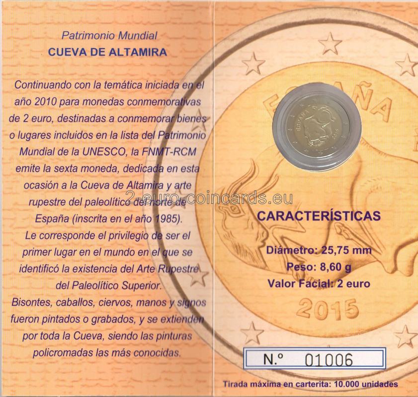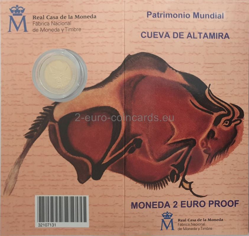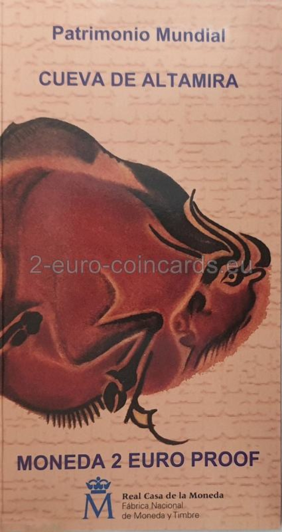 Pokračujúc v téme pamätných mincí v hodnote 2 eur, ktoré boli iniciované v roku 2010 na pripomenutie objektov alebo miest zapísaných do zoznamu svetového dedičstva UNESCO, FNMT-RCM (Fábrica Nacional De Moneda Y Timbre - Real Casa De La Moneda) vydáva šiestu mincu, ktorá je pri tejto príležitosti venovaná jaskyni Altamira a paleolitickému skalnému umeniu v severnom Španielsku (zapísaná v roku 1985). Jaskyňa má tú česť, že je prvým miestom na svete, kde bola identifikovaná existencia skalného umenia z obdobia najstaršieho paleolitu. V jaskyni boli namaľované alebo vyryté zubry, kone, jelene, ruky a znaky, ktoré sú rozmiestnené po celej jaskyni, pričom najznámejšie sú polychrómované maľby.
