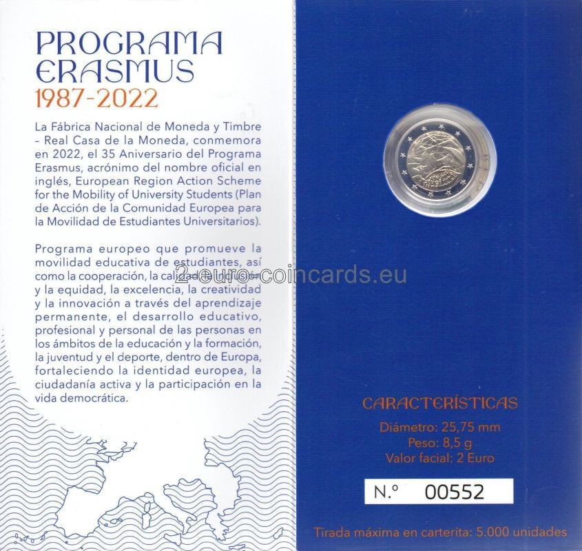 FNMT-RCM (Fábrica Nacional De Moneda Y Timbre - Real Casa De La Moneda) si v roku 2022 pripomína 35. výročie programu Erasmus, akronym oficiálneho názvu v angličtine European Region Action Scheme for the Mobility of University Students (Akčný plán Európskeho spoločenstva pre mobilitu vysokoškolských študentov). Európsky program, ktorý podporuje vzdelávaciu mobilitu študentov, ako aj spoluprácu, kvalitu, inklúziu a rovnosť, excelentnosť, tvorivosť a inovácie prostredníctvom celoživotného vzdelávania, vzdelávací, profesionálny a osobnostný rozvoj jednotlivcov v oblasti vzdelávania a odbornej prípravy, mládeže a športu v rámci Európy, posilňovanie európskej identity, aktívne občianstvo a účasť na demokratickom živote.