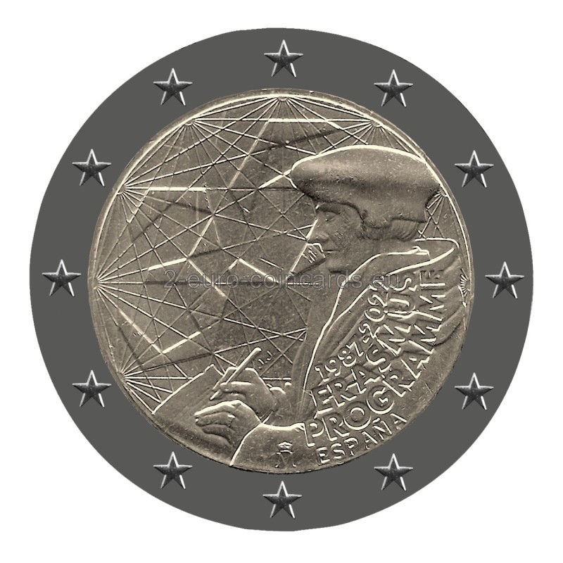 Návrh je kombináciou dvoch hlavných prvkov programu Erasmus: pôvodná intelektuálna inšpirácia, samotný Erasmus a alegória jeho vplyvu na Európu. Prvú symbolizuje jedno z najznámejších vyobrazení Erasma. Druhý je symbolizovaný zväzkom lúčov predstavujúcim väzby, ktoré prechádzajú naprieč mincou od jedného svetelného zdroja k druhému a reprezentujú množstvo intelektuálnych a ľudských výmen medzi európskymi študentkami a študentmi. Ako odkaz na Európu niektoré z týchto lúčov tvoria iné hviezdy, ktoré vznikli vďaka synergiám medzi krajinami. Medzi líniami sú tiež iniciály autora mince "J.J." (Joaquin Jimenez). Číslo 35, zodpovedajúce tridsiatemu piatemu výročiu, vystupuje z hviezd v modernom grafickom štýle. Vpravo dole sú nápisy v štyroch riadkoch: "1987-2022", "PROGRAM ERASMUS", "ESPAÑA". V spodnej časti je označenie Španielskej kráľovskej mincovne (korunované písmeno "M").