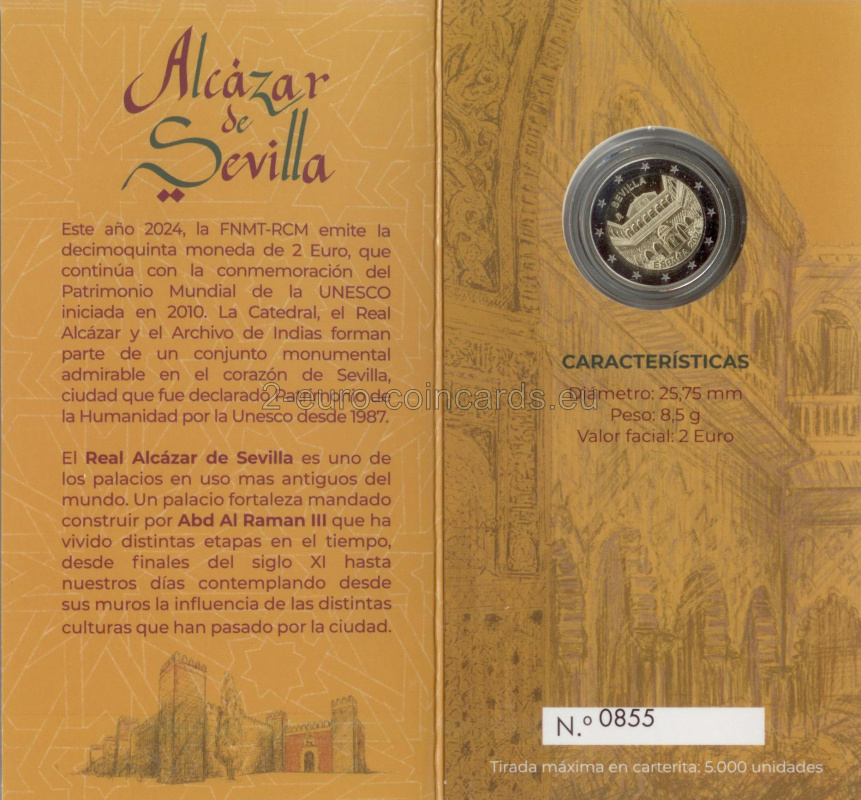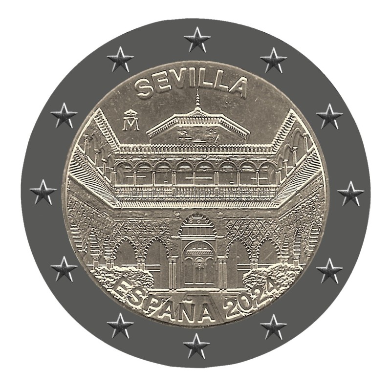 Motívom mince je Uznanie Sevilly (Archivo General de Indias, Real Alcazar de Sevilla a Catedral de Sevilla) za lokalitu svetového dedičstva UNESCO. Návrh zobrazuje pohľad na „Patio de las Doncellas“ v Real Alcazar v Seville. V hornej časti je veľkými písmenami v kruhu uvedený nápis SEVILLA; pod ním sa nachádza značka mincovne „Eme Coronada“. V dolnej časti je v kruhu veľkými písmenami uvedený nápis ESPANA a rok vydania 2024.