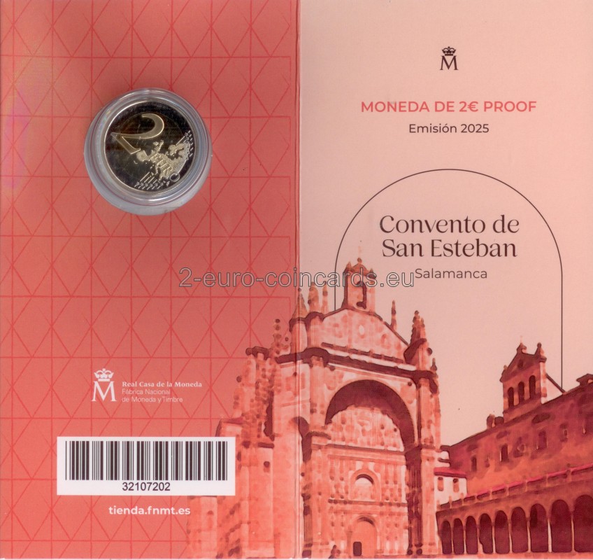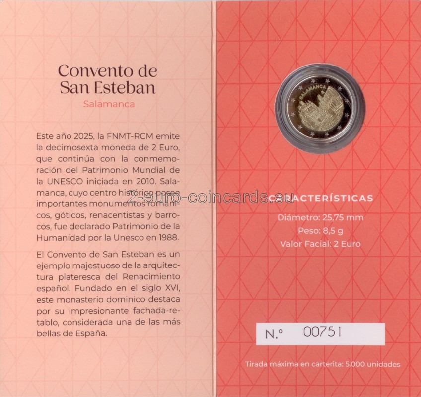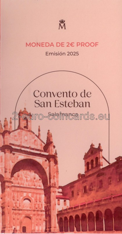 Na lícnej strane mince je detailný pohľad na staré mesto Salamanca. V strede je zreteľne vidieť zdobené priečelie kostola San Esteban, skvostu platereskej architektúry. Napravo od kostola je viditeľná aj veža dominikánskeho kláštora. V popredí majestátne stojí socha, ktorá vzdáva hold intelektuálnej a umeleckej histórii mesta. Celok je obklopený stromami, V hornej časti mince sa číta nápis „SALAMANCA“. V spodnej časti je nápis „ESPAÑA 2025“ označujúci vydávajúcu krajinu a rok razby. Na pravej strane sa nachádza značka mincovne Fabrica Nacional de Moneda y Timbre Real Casa de la Moneda - písmeno „M" s korunkou.