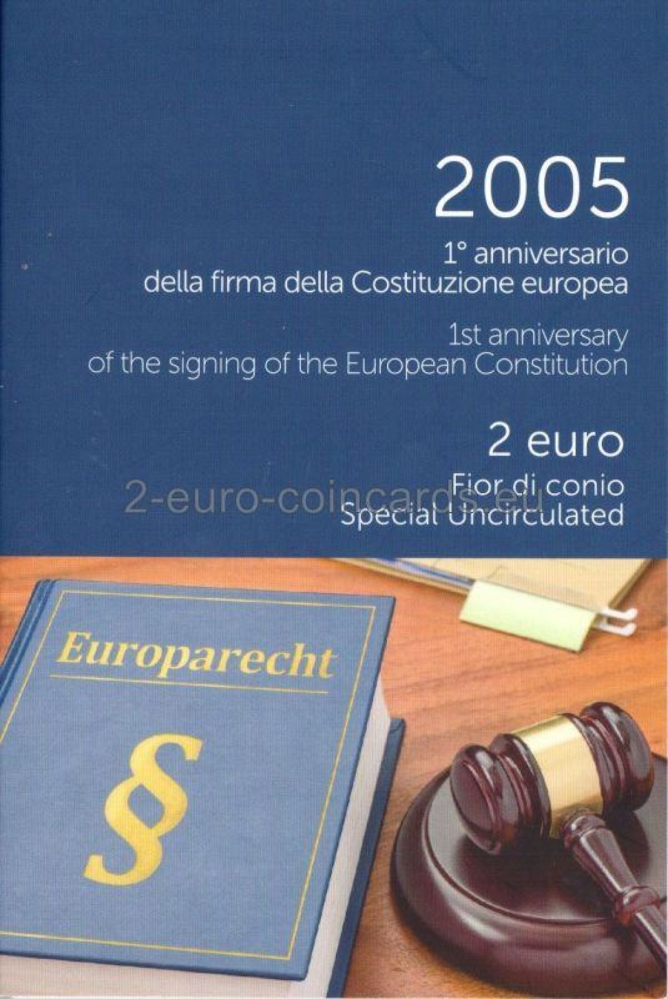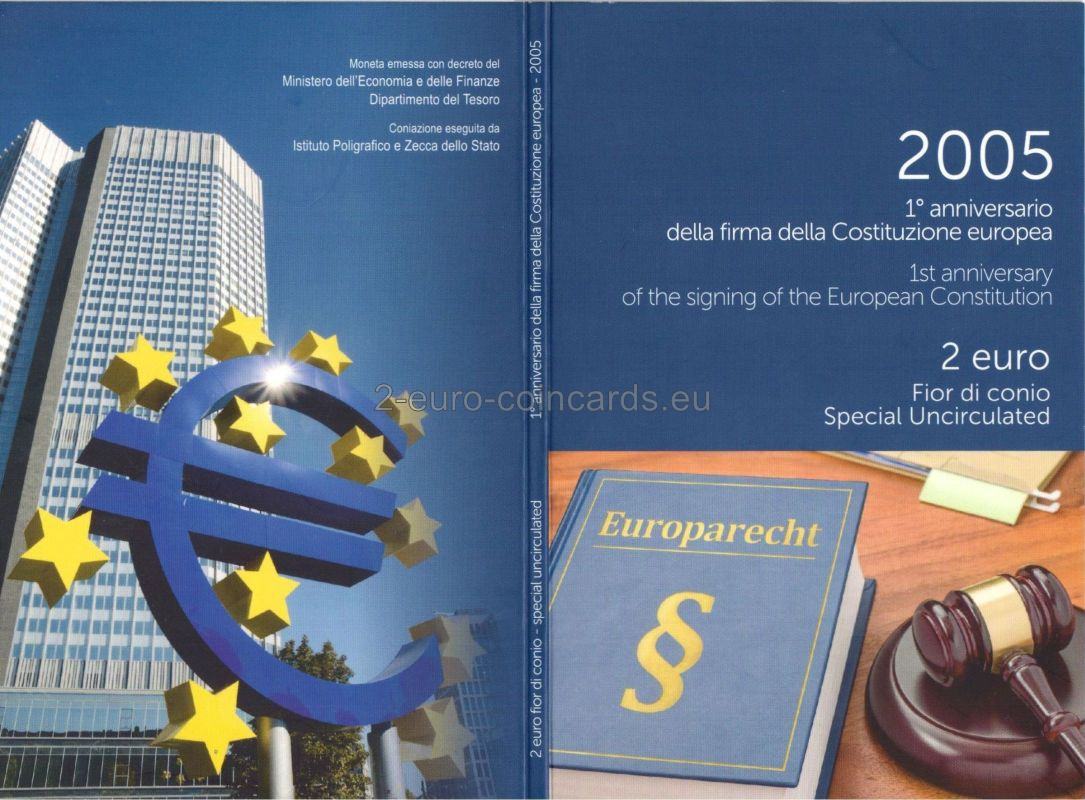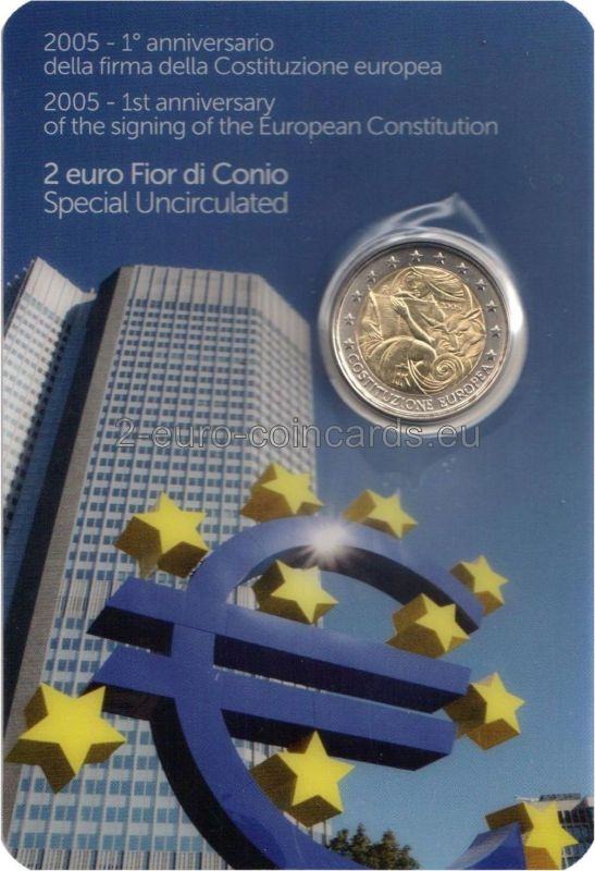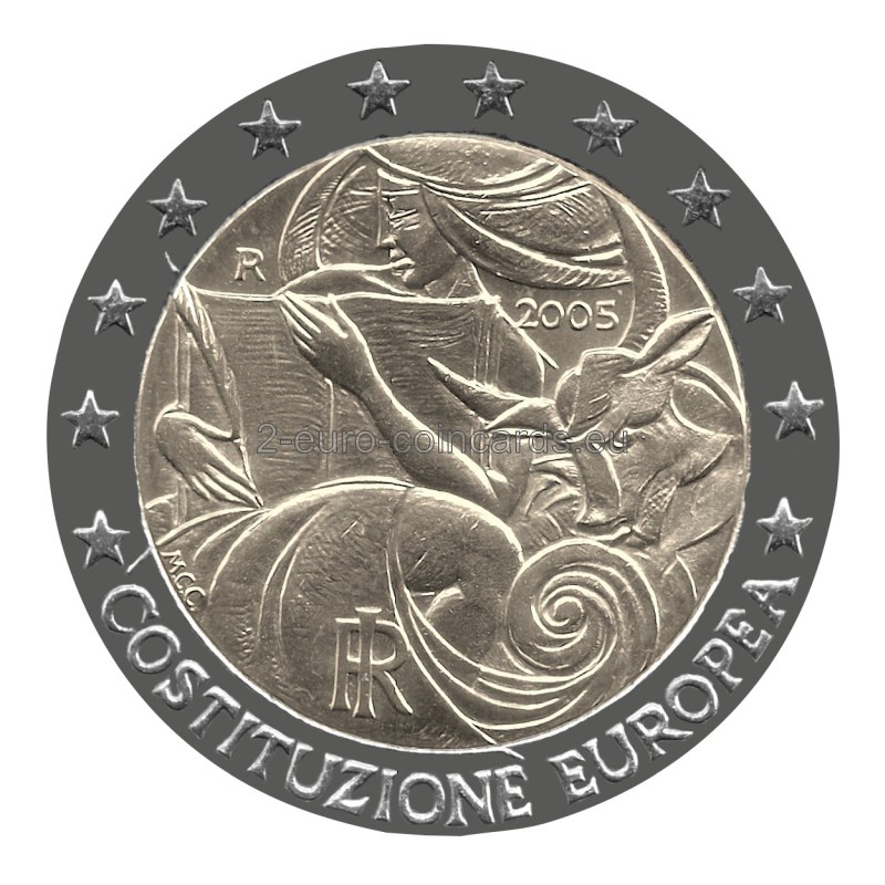Vo vnútornej časti mince je vyobrazená Európa a býk. Európa drží pero a text európskej ústavy. V hornej ľavej časti vzoru mince sa nachádza značka mincovne „R“. Vľavo dole sú iniciály autorky rytiny Marie Carmely Colaneriovej „MCC“. Rok razenia je umiestnený v hornej pravej časti vzoru nad hlavou býka. V dolnej časti vzoru mince je monogram Talianskej republiky „RI“. Slová „COSTITUZIONE EUROPEA“ vytvárajú polkruh na dolnom vonkajšom okraji mince.