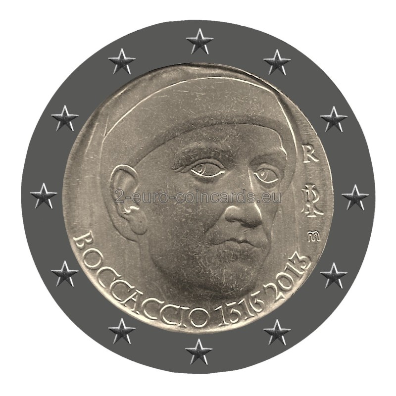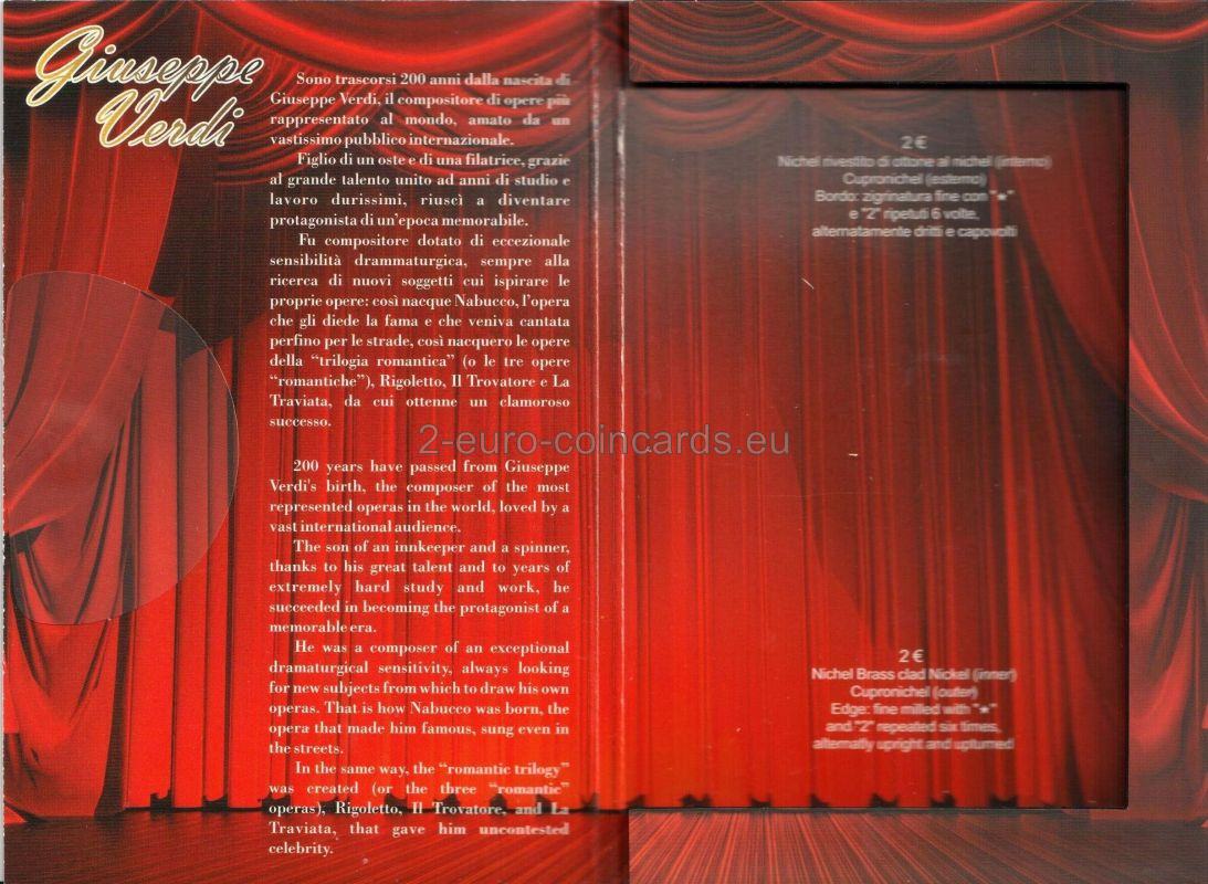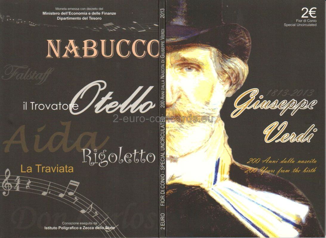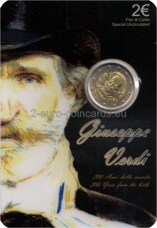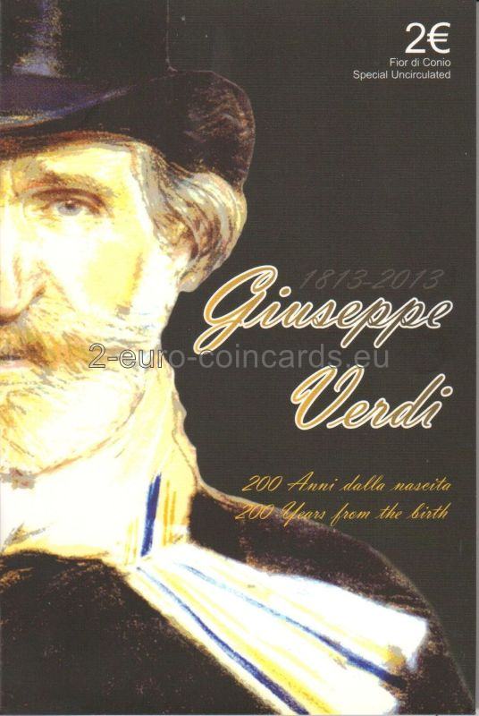 Vzor znázorňuje bustu Giuseppeho VERDIHO v trojštvrtinovom profile otočenú doľava; na ľavej strane zväčšené písmená monogramu Talianskej republiky „RI“/1813; na pravej strane písmeno R (monogram mincovne v Ríme)/2013; na spodnej časti mince sa nachádzajú písmená MCC (monogram mena autorky Marie Carmely COLANERIOVEJ)/G. VERDI.