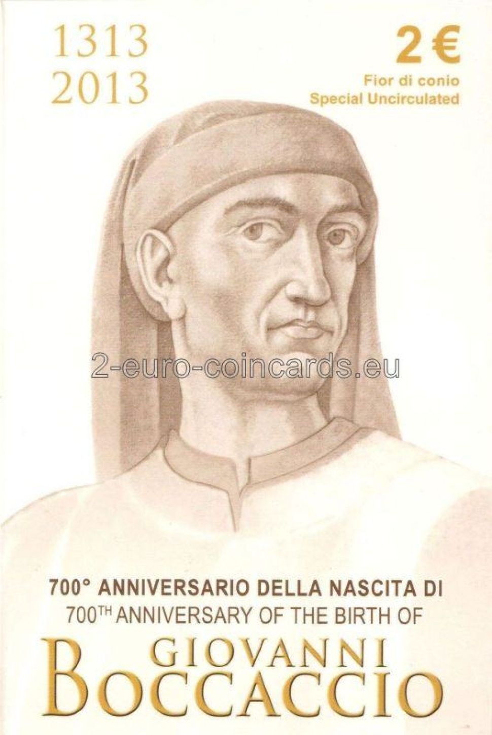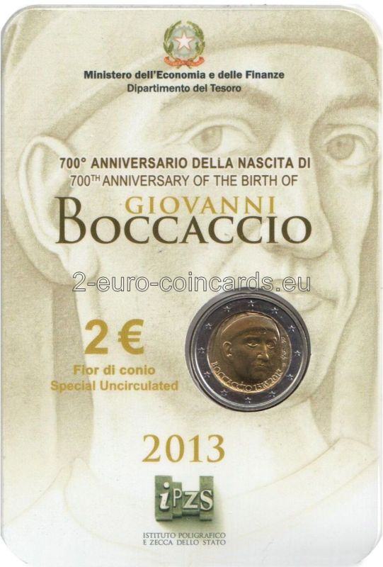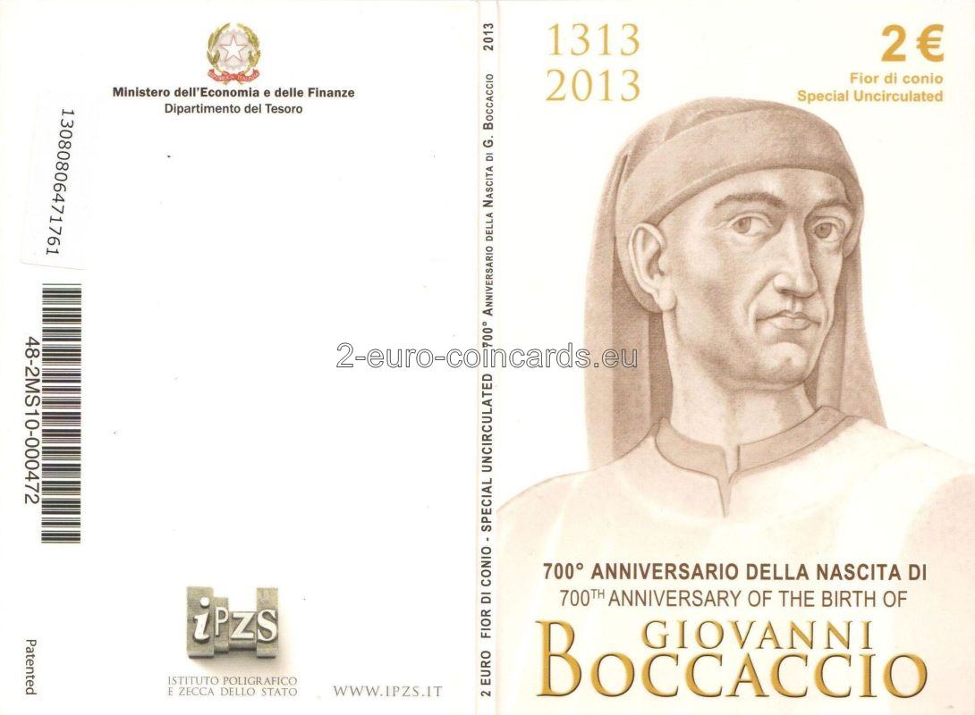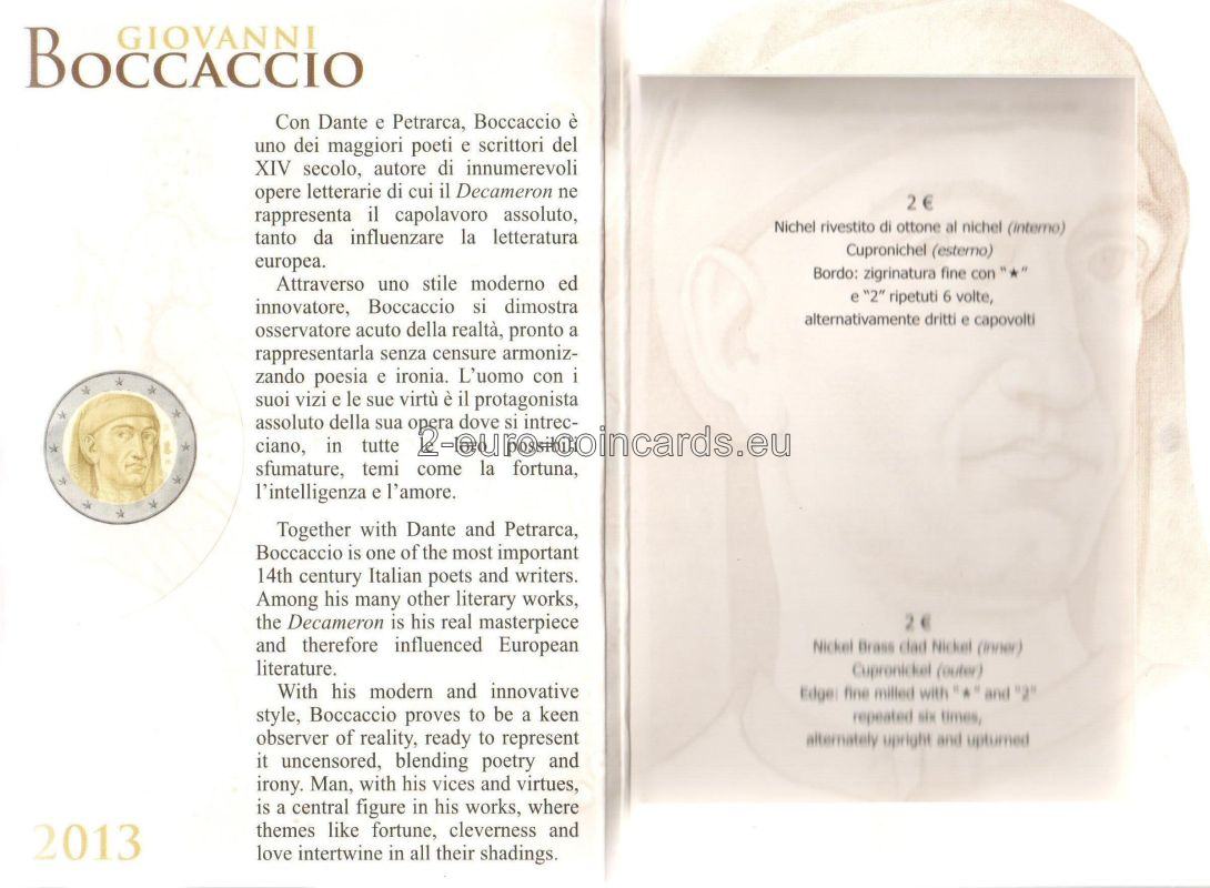 Vzor znázorňuje hlavu Giovanniho BOCCACCIA v trojštvrtinovom profile otočenú doprava, ktorá bola nakreslená podľa fresky autora Andreu del Castagna okolo roku 1450 (Florencia, Galleria degli Uffizi); v spodnej časti je nápis BOCCACCIO 1313 2013; na pravej strane zväčšené písmená R (monogram mincovne v Ríme)/RI (monogram Talianskej republiky)/m (monogram autora Mauriho).