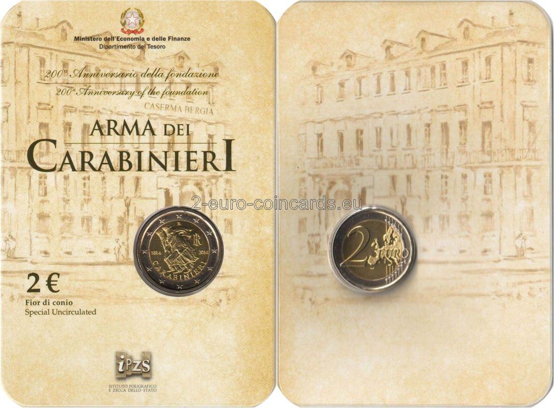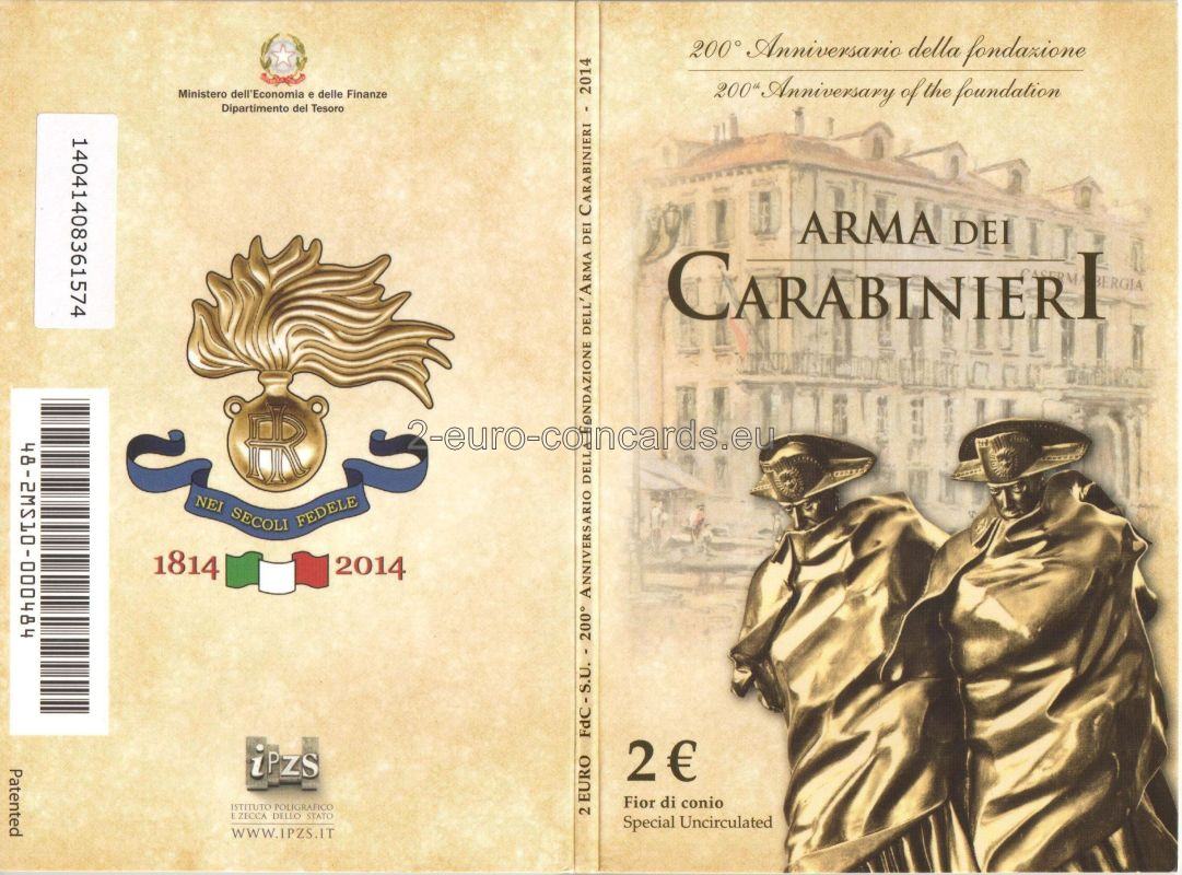 Averz: Reinterpretácia hliadky karabinierov v búrke, socha, ktorú vytvoril Antonio Berti v roku 19 73; okolo, dole, nápis "CARABINIERI"; vľavo rok založenia "1814"; vpravo skratka Talianskej republiky "RI" a rok vydania "2014"; dole. "LDS" iniciály autora Luciana De Simoniho, nad nimi písmeno "R"; všetko okolo dvanásťcípej hviezdy, Európskej únie.