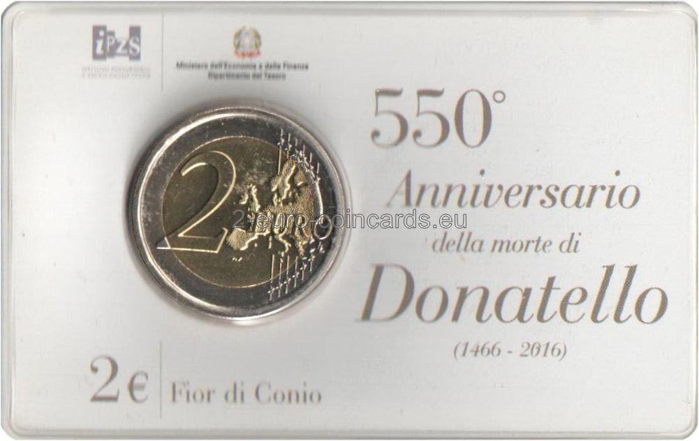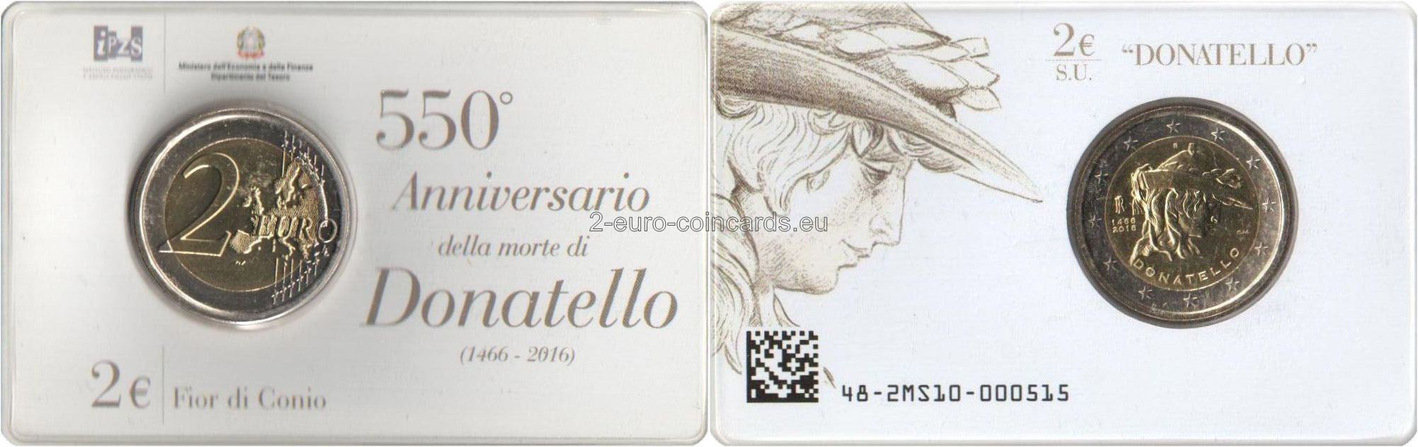 Na minci je zobrazená hlava Dávida od Donatella (detail bronzovej sochy vystavenej v Národnom múzeu Bargello vo Florencii). Naľavo od nej sa nachádza monogram Talianskej republiky „RI“ a pod ním v dvoch riadkoch roky „1466“ a „2016“. V pravej časti mince sú uvedené iniciálky autorky Claudie Momoniovej „C.M.“ a v spodnej časti mince nápis „DONATELLO“.