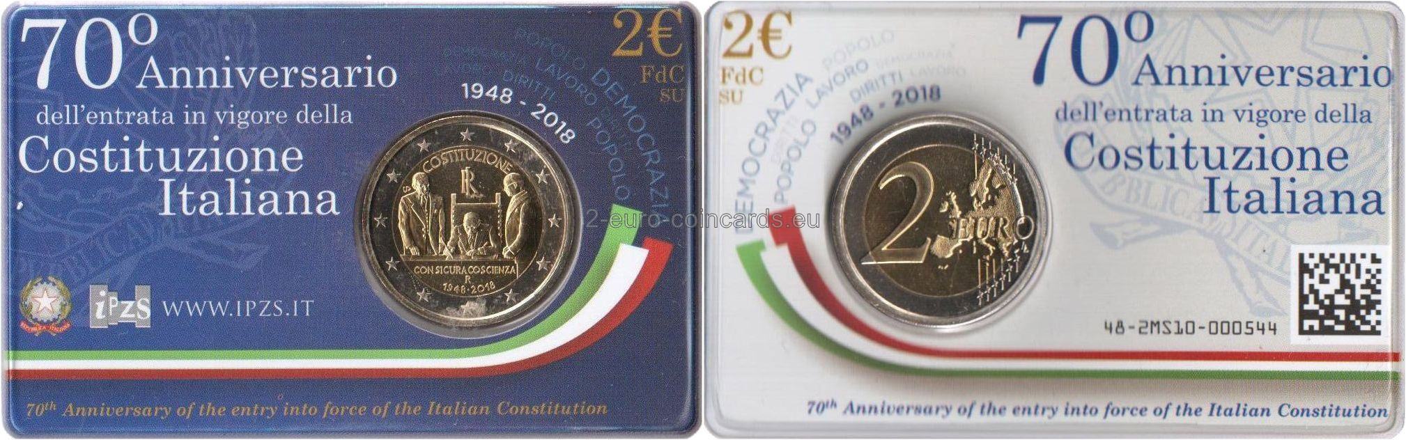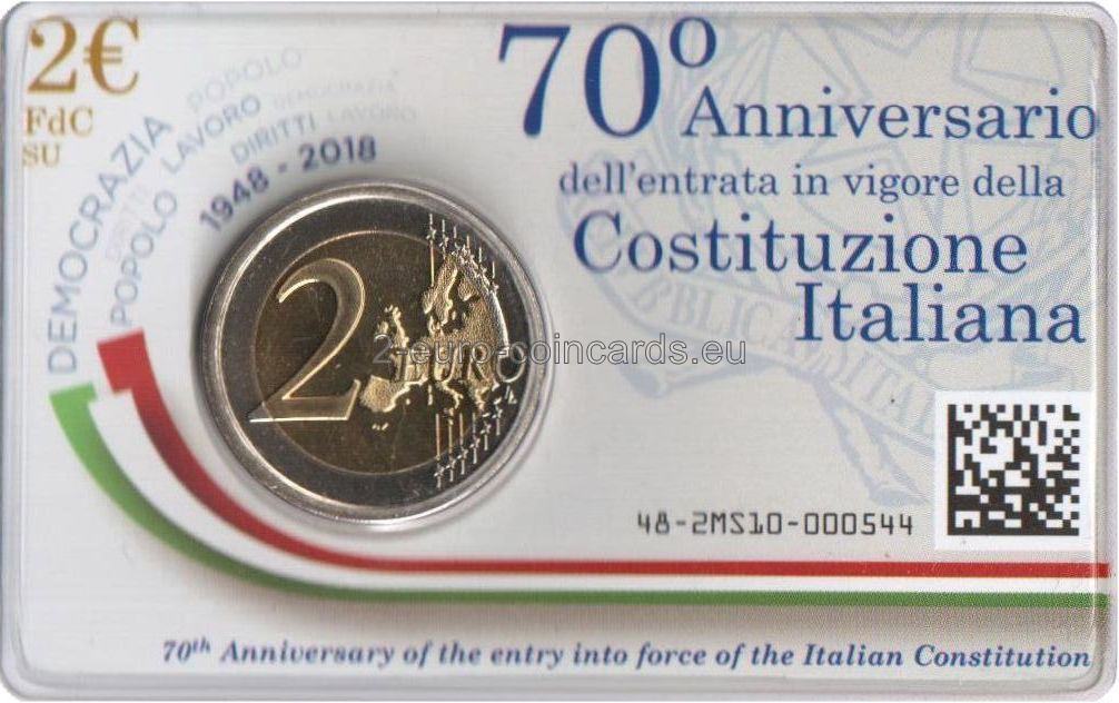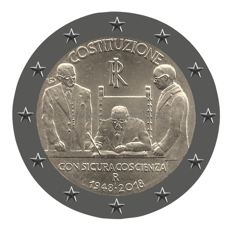 Enrico De Nicola, dočasná hlava štátu, podpisuje 27. decembra 1947 vyhlásenie ústavy Talianskej republiky. Po jeho pravici stojí predseda vlády Alcide de Gasperi, po jeho ľavici Umberto Terracini, predseda ústavodarného zhromaždenia Talianska. Nad nimi je uvedený nápis „COSTITUZIONE“ a monogram Talianskej republiky „RI“. V dolnej časti sa nachádza nápis „CON SICURA COSCIENZA“, „R“, značka mincovne v Ríme, a dátumy „1948 • 2018“, z ktorých prvý označuje rok nadobudnutia platnosti talianskej Ústavy a druhý znamená rok vydania mince.