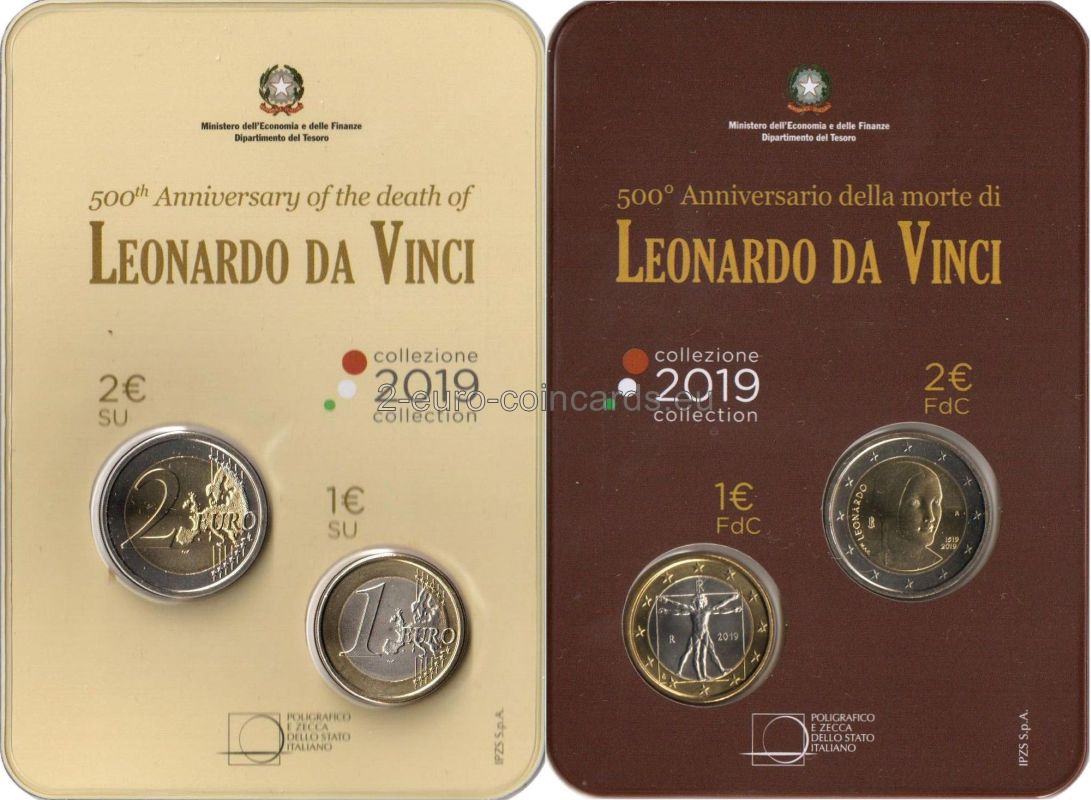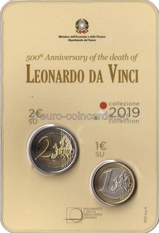 Minca zachytáva detail maľby Leonarda da Vinci „Dama con l’ermellino“ (Dáma s hranostajom, Národné múzeum v Krakove). Vľavo sa nachádza nápis „LEONARDO“, iniciály autorky Marie Angely Cassolovej „MAC“ a skratka Talianskej republiky „RI“. Vpravo je značka rímskej mincovne „R“ a letopočty 1519 a 2019, teda rok Leonardovho úmrtia a rok vydania mince.