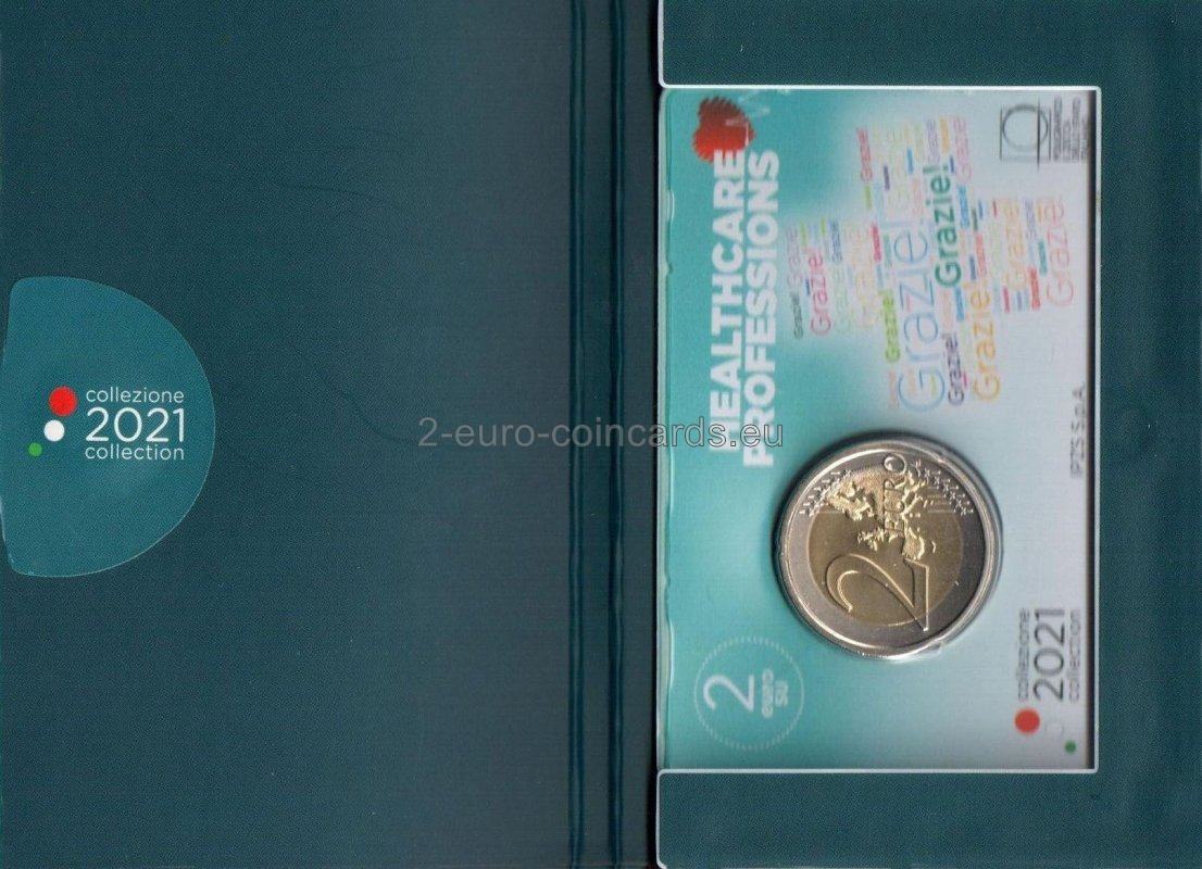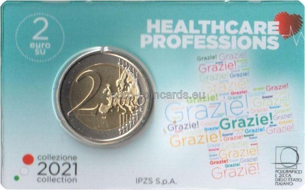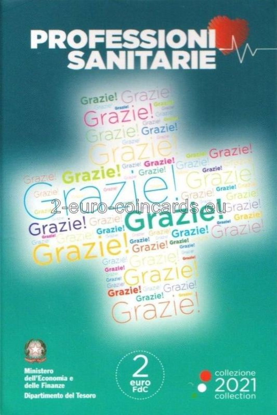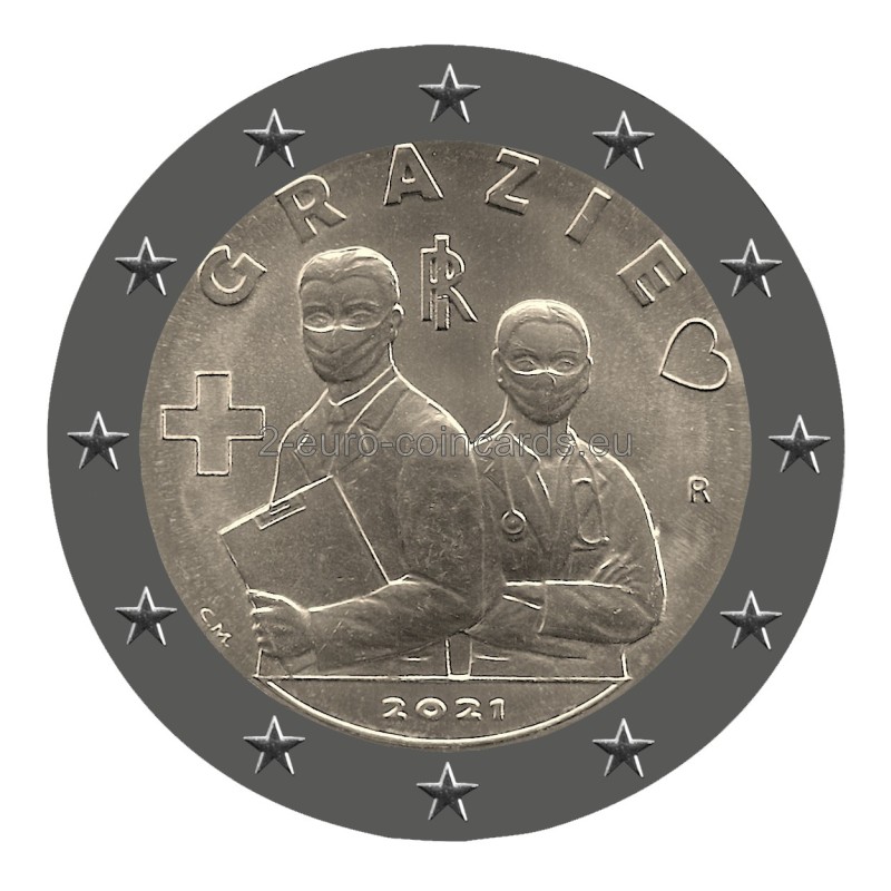 V strede vzoru sú vyobrazení muž a žena v lekárskych plášťoch a rúškach, so stetoskopom a zdravotnou dokumentáciou ako symbol lekárov a sestier, ktorí bojujú v prvej línii proti pandémii COVID-19. Hore je napísané slovo „GRAZIE“, vpravo za ním je znázornené srdce a naľavo zdravotnícky kríž. V strede sa nachádza skratka Talianskej republiky „RI“ a vpravo písmeno „R“, značka rímskej mincovne. Dole vľavo sú uvedené iniciály autorky vzoru Claudie Momoniovej „CM“ a v spodnej časti rok vydania mince „2021“.