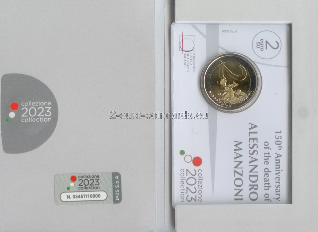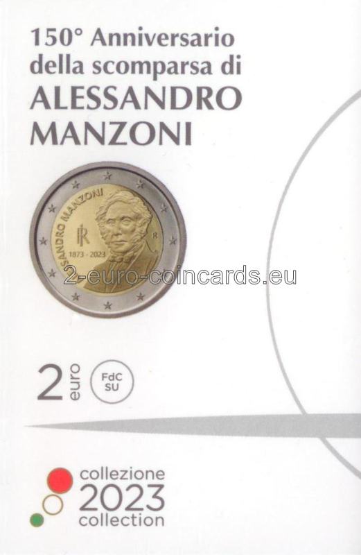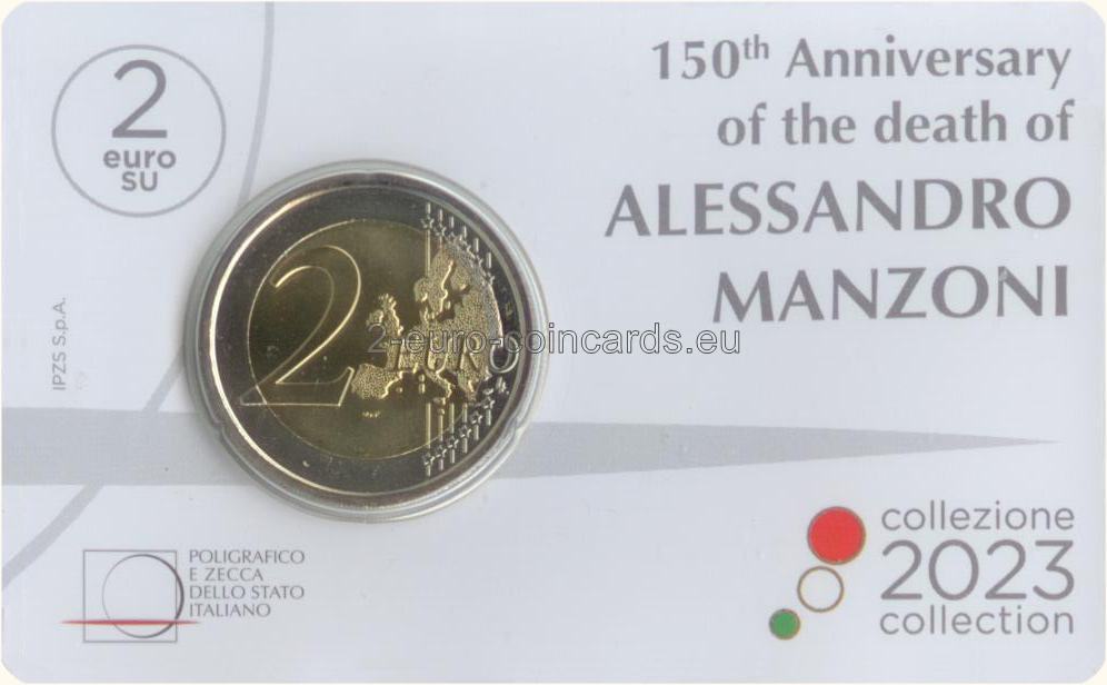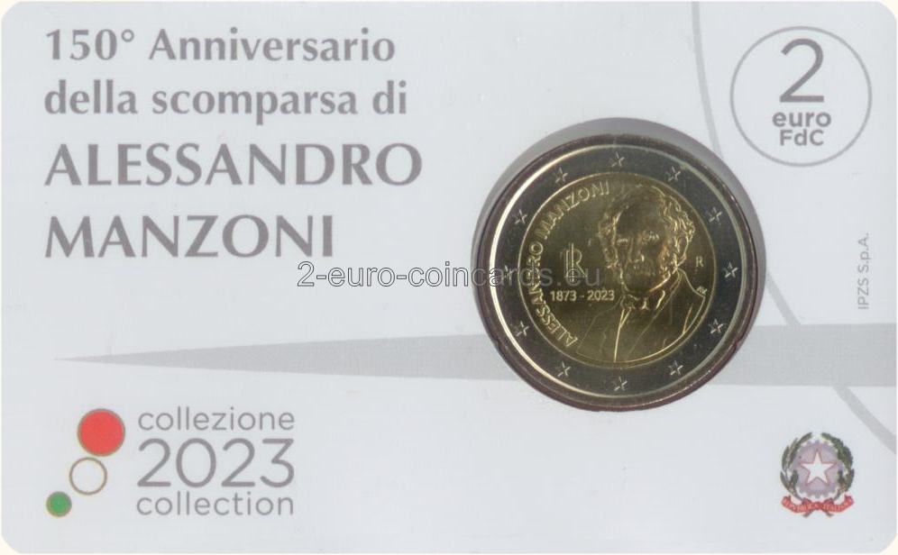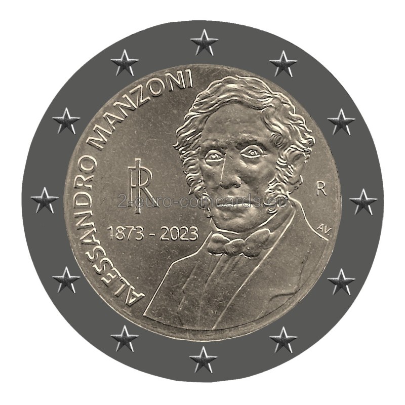 Na minci je vyobrazený polovičný portrét Alessandra Manzoniho podľa podobizne tohto talianskeho spisovateľa na bankovke v hodnote 100 000 lír vydanej v roku 1967. Vľavo sa nachádza skratka Talianskej republiky „RI“, roky „1873 – 2023“, t. j. rok úmrtia spisovateľa a rok vydania mince, a v polkruhu je uvedené meno spisovateľa „ALESSANDRO MANZONI“. Vpravo je zobrazené písmeno „R“ symbolizujúce rímsku mincovňu a písmená „AV“ predstavujúce iniciály autora motívu Antonia Vecchia.