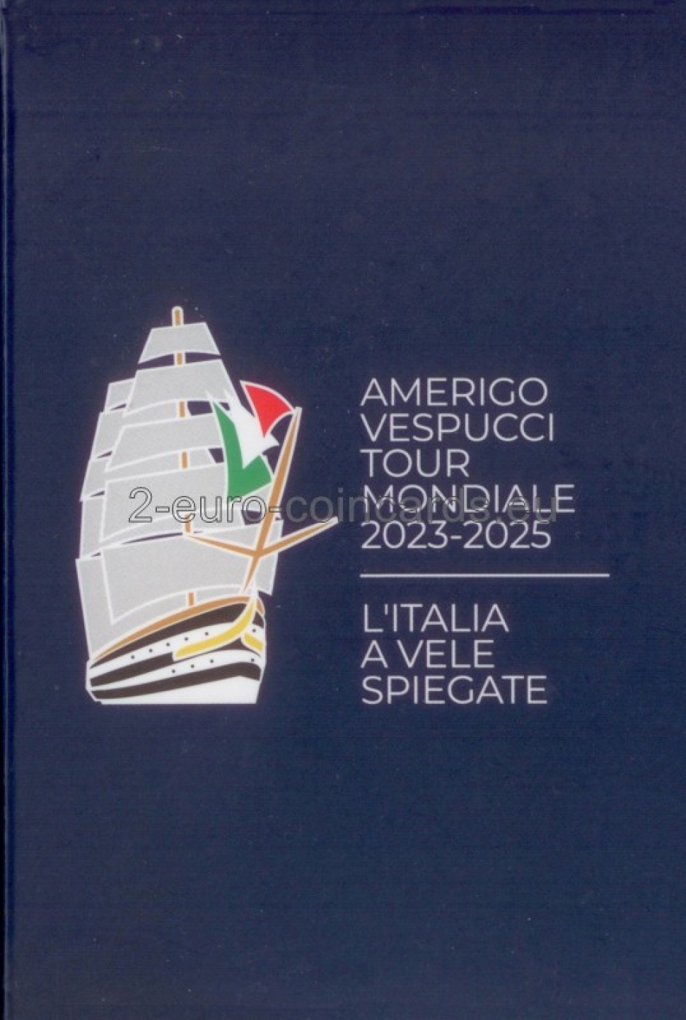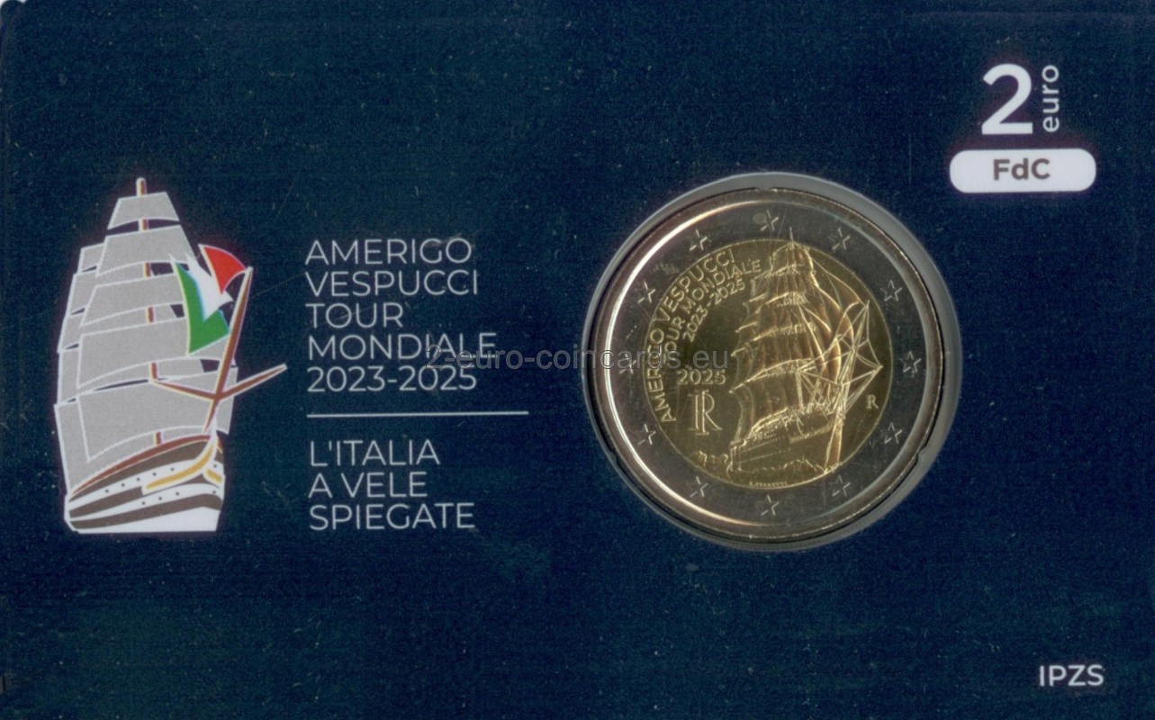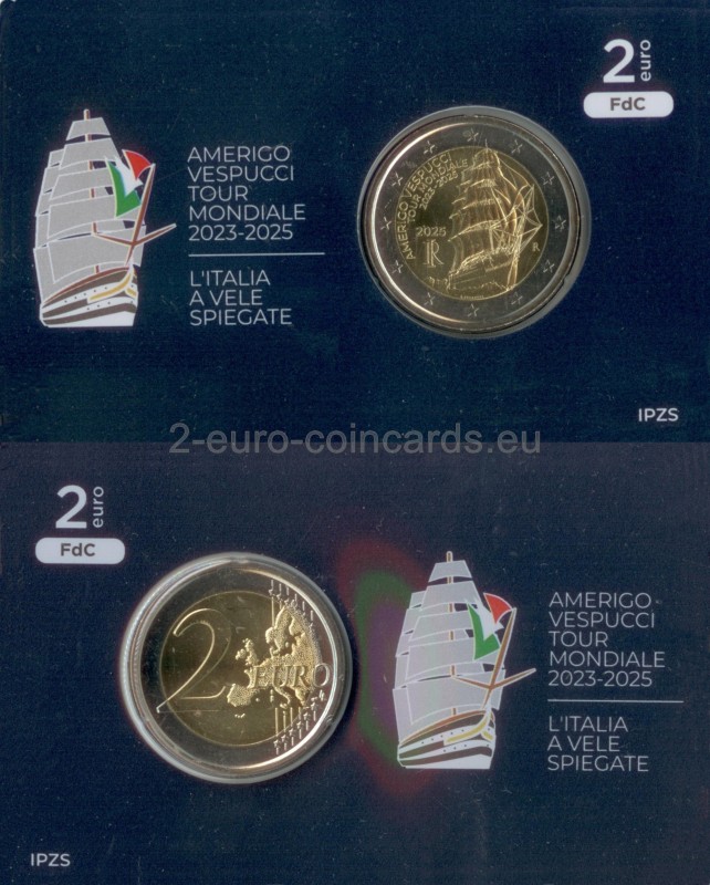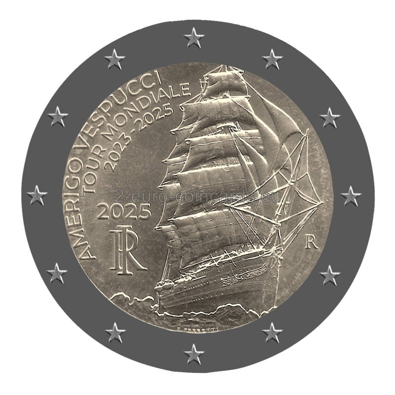 V strede motívu sa nachádza silueta lode Amerigo Vespuci ktorá s rozvinutými plachtami brázdi morské vlny, vľavo je nápis "AMERIGO VESPUCCI TOUR MONDIALE 2023-2025" Pod nápisom sa náchádza letopočet vydania mince "2025" a skratka Talianskej republiky „RI“. Vpravo je značka talianskej mincovne "R".