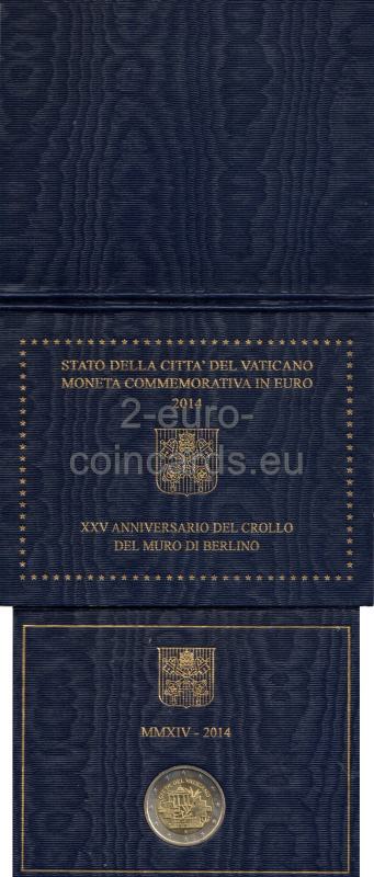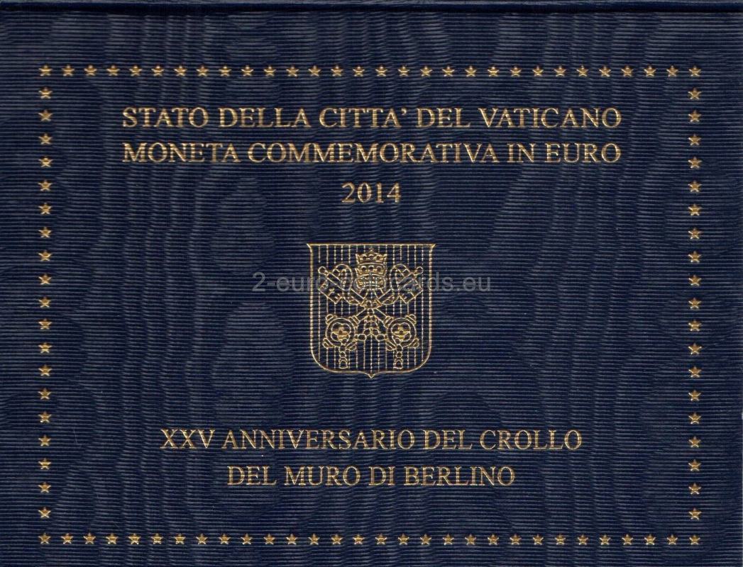 V popredí vzoru je zobrazených niekoľko tehál z čiastočne zbúraného Berlínskeho múra, na ktorých je nápis „XXV ANNIVERSARIO DEL CROLLO DEL MURO DI BERLINO 1989 2014“ (25. výročie pádu Berlínskeho múra 1989 2014). Uprostred vo voľnom priestore medzi tehlami a kúskom ostnatého drôtu je olivová ratolesť s Brandenburskou bránou v pozadí. Hornú časť vypĺňa nápis „CITTÀ DEL VATICANO“. V spodnej časti označenie mincovne (písmeno "R"). Na ľavom okraji je označenie rytca "C.M.inc" a umelca "G. TITOTTO".