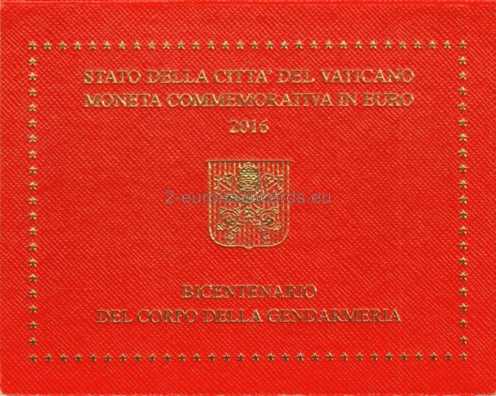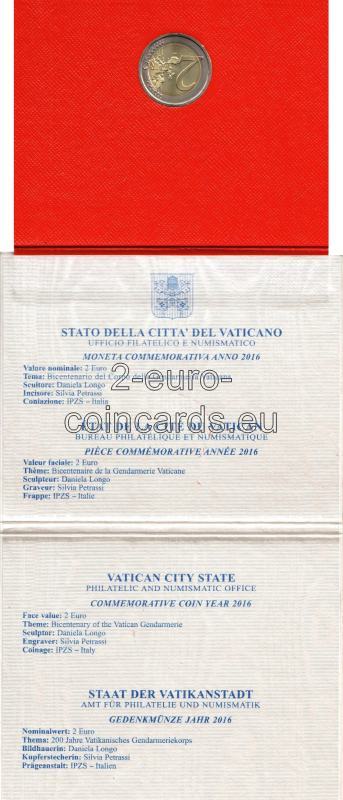Na národnej strane je vyobrazený príslušník vatikánskej polície pred Bazilikou svätého Petra V hornej časti sa v polkruhu nachádza nápis „CORPO DELLA GENDARMERIA 1816-2016“. V dolnej časti je v polkruhu uvedený názov vydávajúcej krajiny „CITTA‘ DEL VATICANO“. Značka mincovne „R“ a a označenie rytca "SP INC"sa nachádzajú na ľavej strane a meno autora „D. LONGO“ je uvedené vpravo.