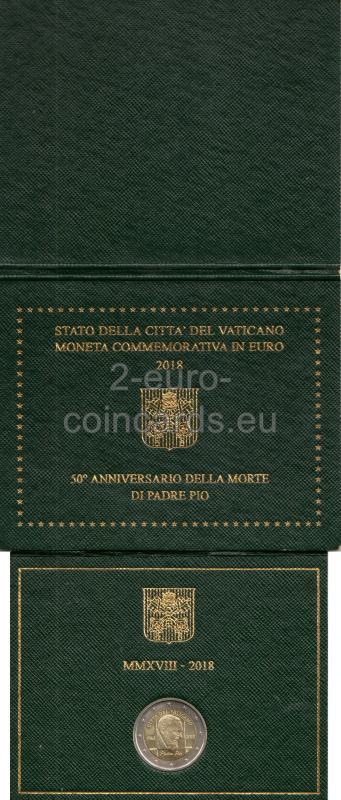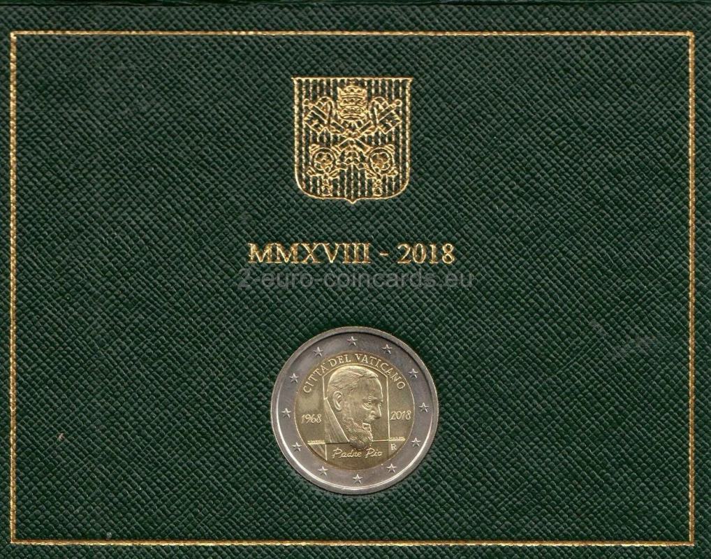 Na minci je vyobrazený portrét Pátra Pia z pravého profilu. V hornej časti je v polkruhu zľava doprava vpísaný názov vydávajúcej krajiny „CITTÀ DEL VATICANO“. V spodnej časti sa nachádza nápis „Padre Pio“ a napravo od neho značka mincovne „R“. Na ľavej strane vzoru je uvedený rok „1968“, na pravej rok vydania „2018“. Vľavo dole je meno umelca „P.DANIELE“.