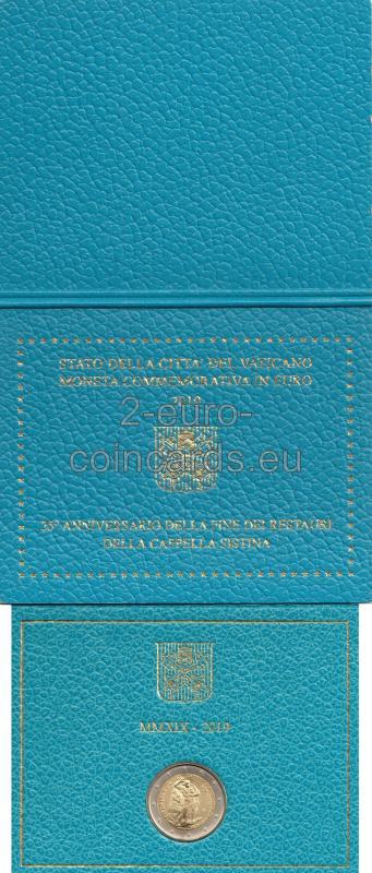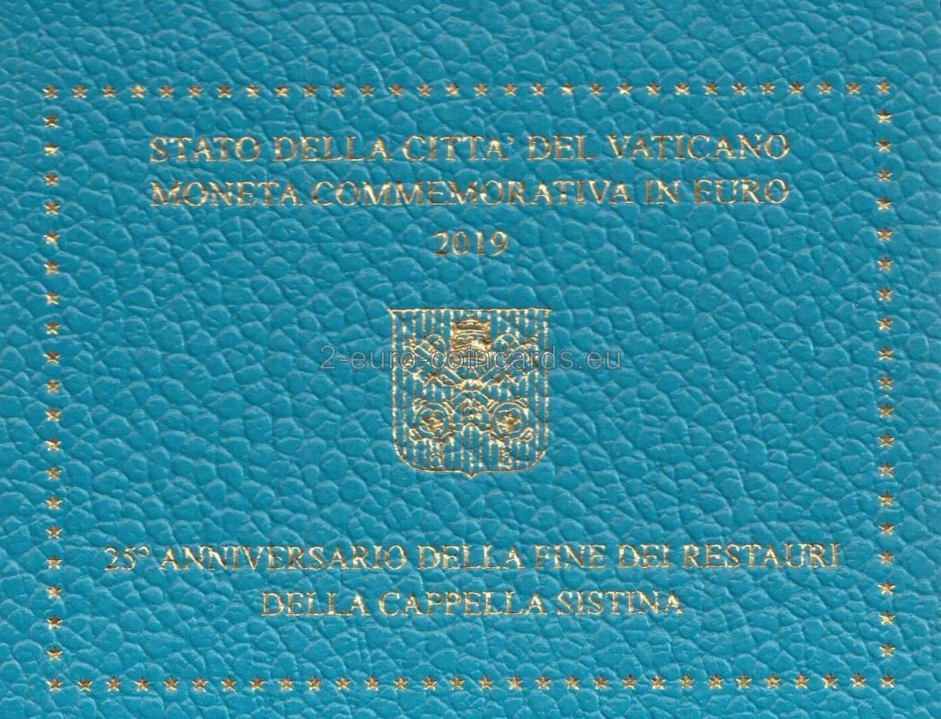Minca bol vydaná pri príležitosti ukončenia reštaurovania Sixtínskej kaplnky, ktoré prebehlo v rokoch 1994 – 2019. Vnútorný disk zobrazuje Pannu Máriu a Krista, fragment Michelangelovej fresky Posledný súd. Na ľavej strane disku je uvedený názov vydávajúceho štátu "CITTA' DEL VATICANO". Nápis na pravej strane, pozdĺž okraja disku: "CAPPELLA SISTINA - FINE DEI RESTAURI" (SIXTINSKA KAPLNKA - KONIEC REŠTAURÁCIE). V druhom riadku sú uvedené roky "1994-2019". V spodnej časti sú označenia umelca "D.LONGO" a rytca "INC.A.M.". Tiež symbol mincovne (písmeno "R").
