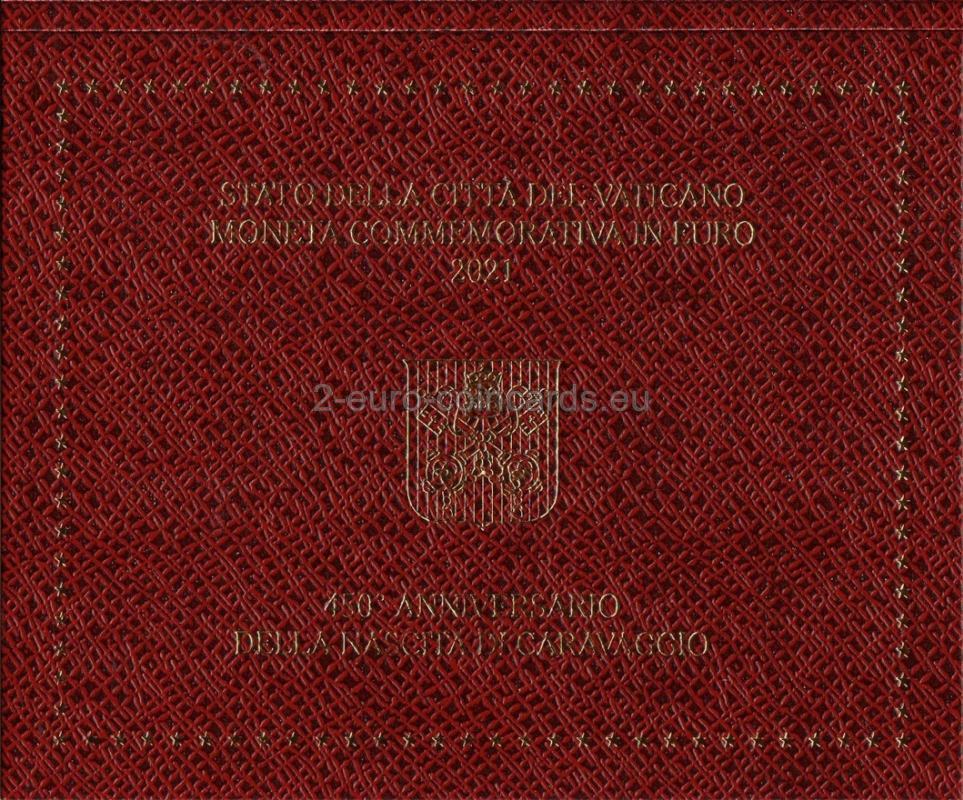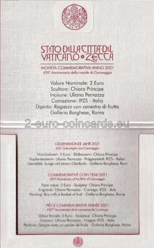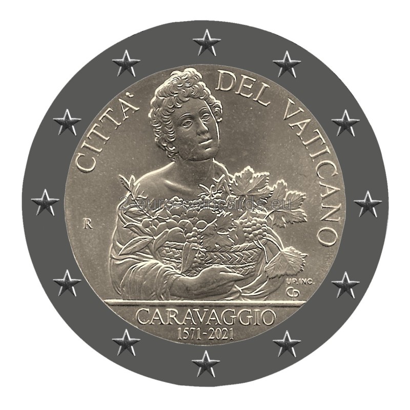 Vnútorný disk zobrazuje Caravaggiovu maľbu mladého muža s košom ovocia. V hornej časti je pozdĺž okraja disku uvedený názov vydávajúceho štátu "CITTA' DEL VATICANO". V spodnej časti je meno umelca "CARAVAGGIO" a v druhom riadku roky "1571-2021". Nachádza sa tu aj značka mincovne (písmeno "R"), iniciály rytca "UP.INC" a umelca "CP".
