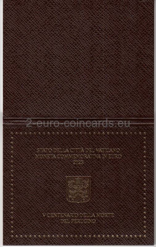 Na vzore je vyobrazený autoportrét Peruginiho a časť fresky "Krst Krista" zo severnej strany Sixtínskej kaplnky. V hornej časti je zľava doprava v polkruhu uvedený nápis „CITTÀ DEL VATICANO“. V dolnej časti sa nachádza nápis „PERUGINO “ a pod ním dátumy „1523◦2023“. Vľavo je značka mincovne "R" a meno autorky mince Daniely Fusco "FUSCO" a rytkyne Annalisi Masini "A.M. INC."