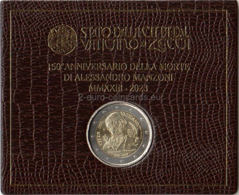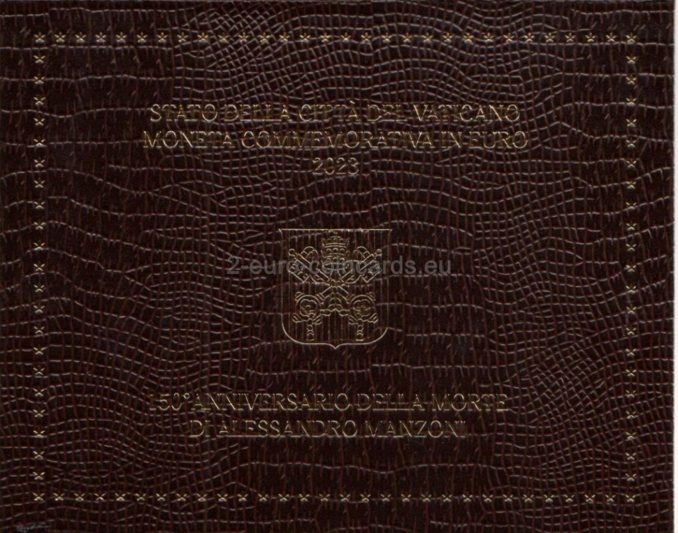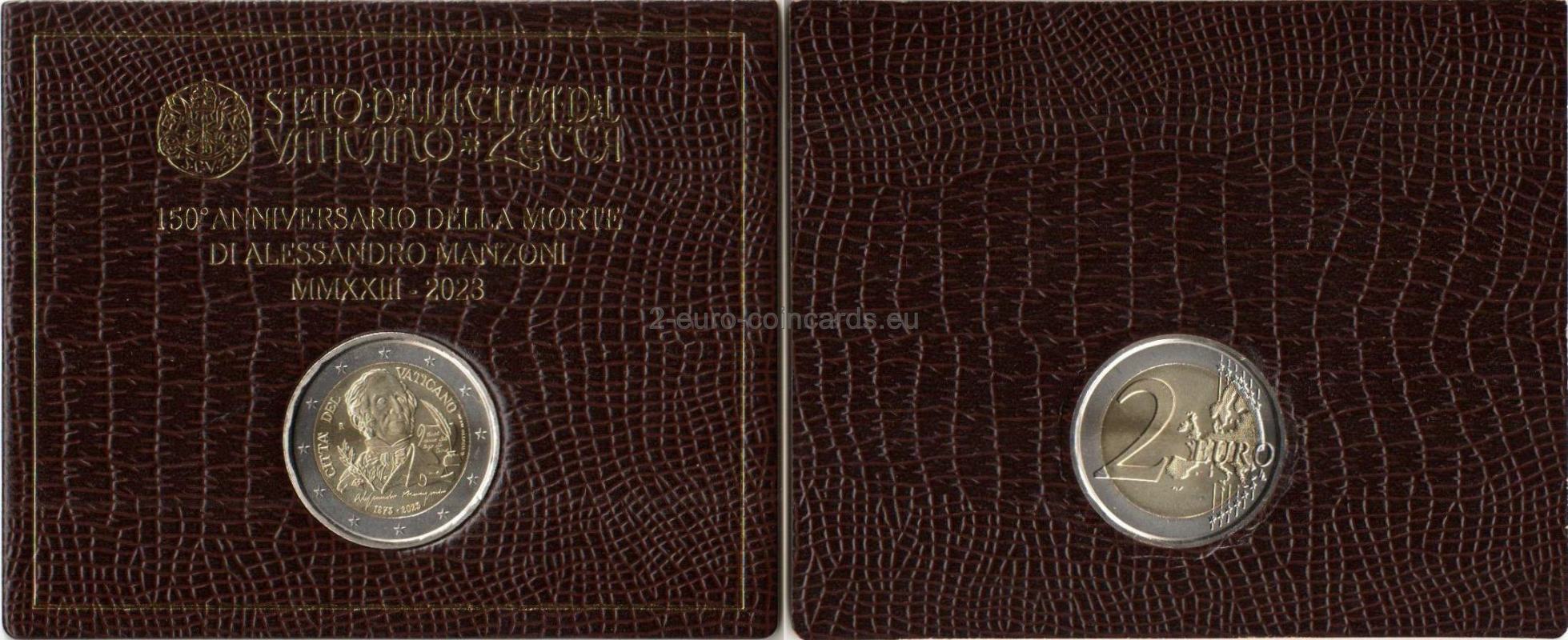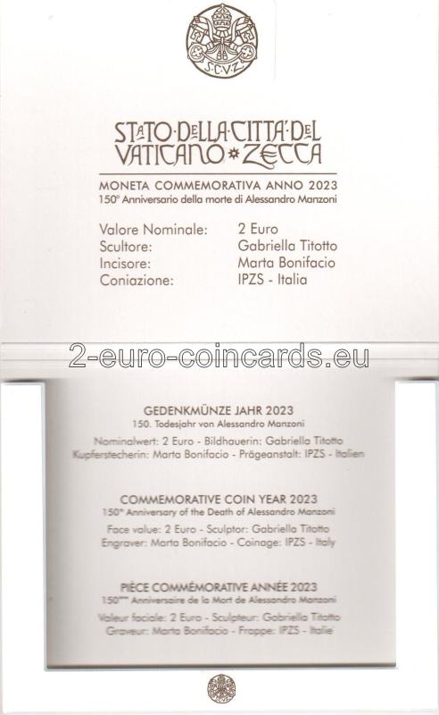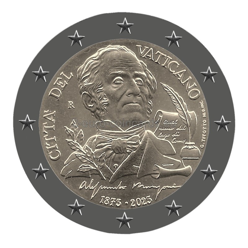 Na minci, ktorú navrhla výtvarníčka Gabriella Titotto, je v strede zobrazená spisovateľova tvár a pod ňou jeho podpis a letpočty 1873-2023; vpravo za kalamárom a brkom je incipit slávneho historického románu "I Promessi Sposi" (Zasnúbení). Vľavo je vavrínová ratolesť, ktorá svedčí o nesmrteľnej sláve veľkého spisovateľa a nad ňou je značka mincovne (písmeno „R“). Názov vydávajúceho štátu „CITTA' DEL VATICANO“ je napísaný pozdĺž okraja disku. Vpravo sú vyryté mená autorky vzoru Gabriella Titoto "G.TITOTO" a rytca Marta Bonifacio l"MB INC."