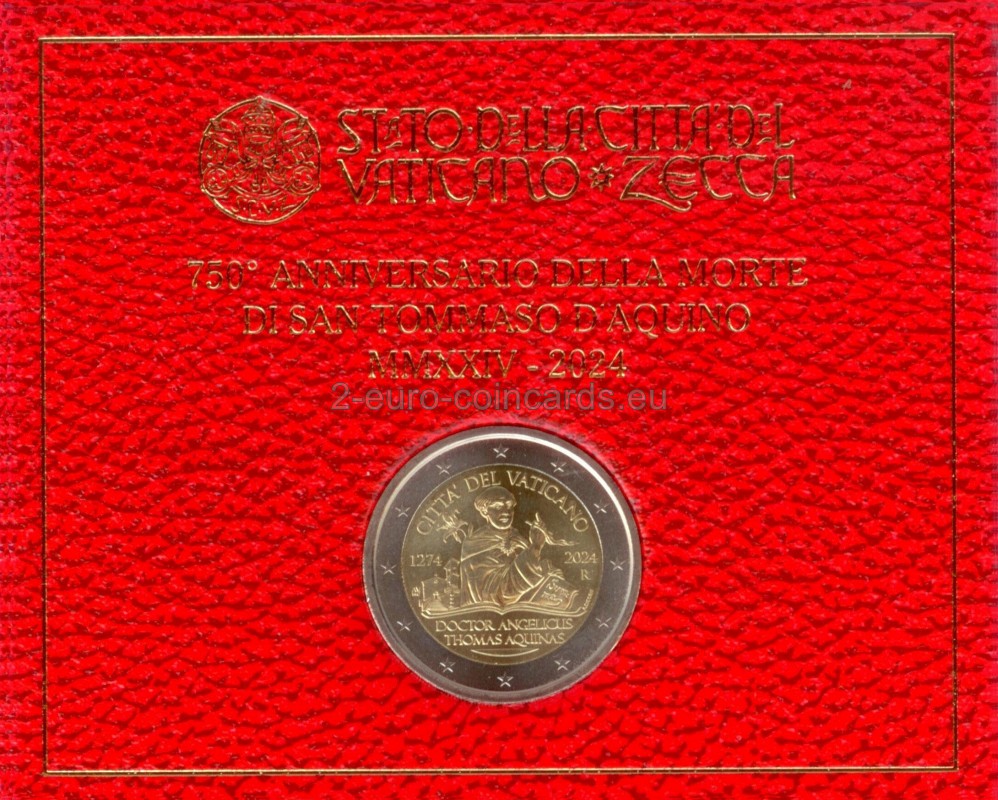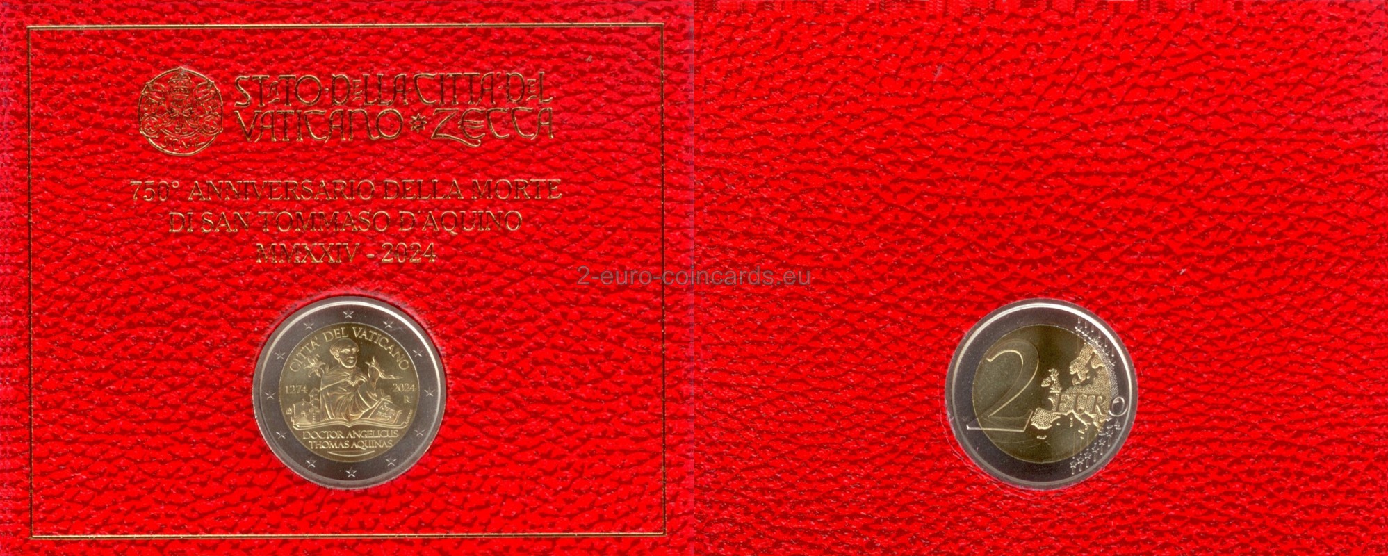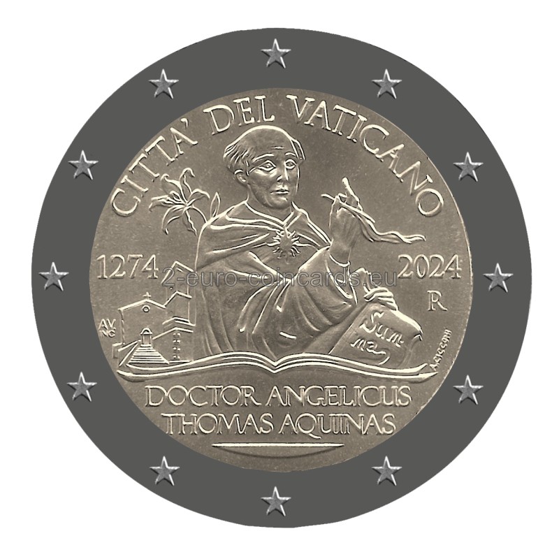 Na minci je v popredí svätý Tomáš Akvinský v habite dominikánskeho rádu, ku ktorému patril. V ľavej ruke drží zväzok svojho najvýznamnejšieho diela Summa Theologica a v druhej ruke drží pierko. Plásť má na hrudi zopnutý 8-cípou hviezdou, jedným zo symbolov dominikánskeho rádu. Spomedzi rôznych titulov, ktoré dostal, je najznámejší titul "anjelský lekár", ktorý oslavuje jeho výnimočnú čistotu duše a tela. V pozadí na ľavej strane je ľalia, symbol čistoty, a Kostol svätého Tomáša v Roccasecce, prvá sakrálna stavba na svete postavená na počesť svätého Tomáša Akvinského, ktorého 18. júla 1323 pápež Ján XXII. vyhlásil za svätého. Pozdĺž horného okraja disku je vyrytý názov vydávajúceho štátu „CITTA' DEL VATICANO“. Naľavo od hlavného obrázku je rok narodenia filozofa „1274“, napravo je rok vydania mince „2024“ a pod ním je značka mincovne „R“. Nápis v spodnej časti v dvoch riadkoch: „DOCTOR ANGELICUS THOMAS AQUINAS“ („ANJELSKÝ DOKTOR THOMAS AQUINAS“, latinsky). Nechýbajú ani iniciály autorky návrhu Arianny Ciccone. „A.CICCONI“ a rytca „AV.INC“.